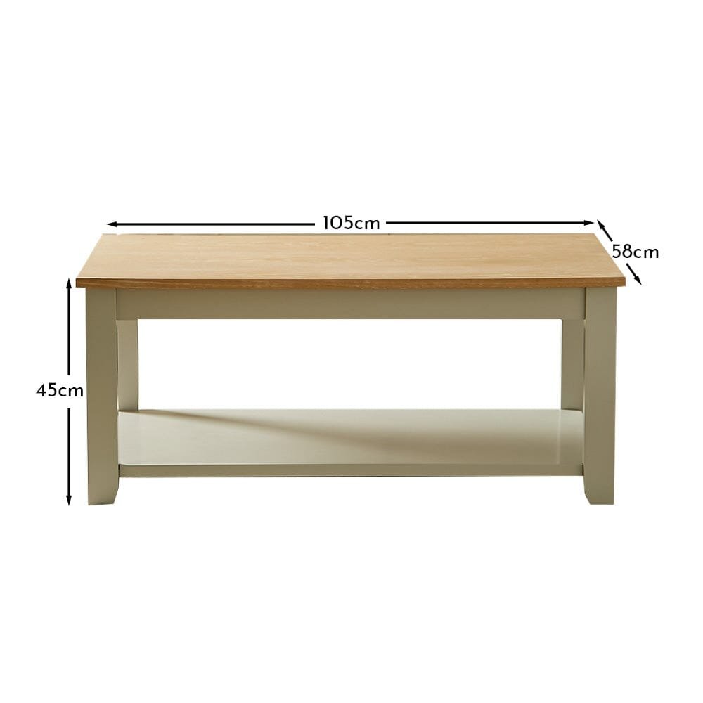The Chatsworth coffee table is finished in an elegant linen grey hue with a whitewash oak veneer top and open shelf beneath the table top. The Chatsworth rectangular coffee table is perfect for refreshing your living space for the new season.