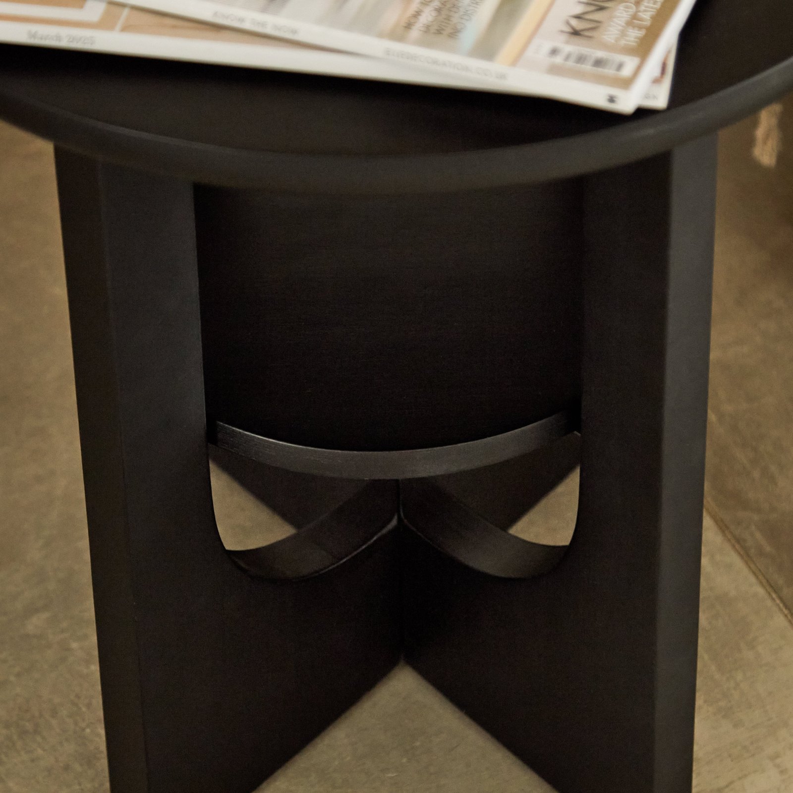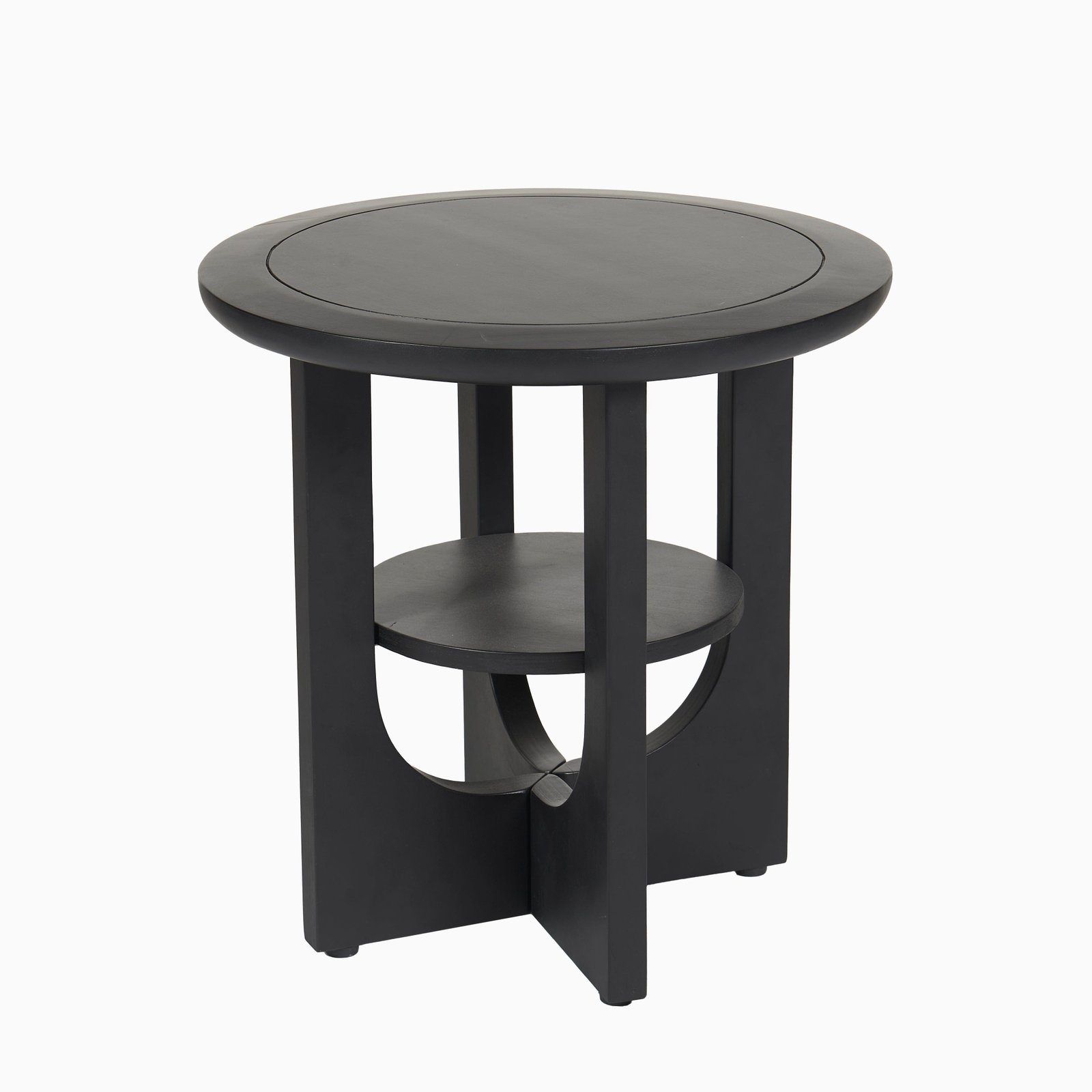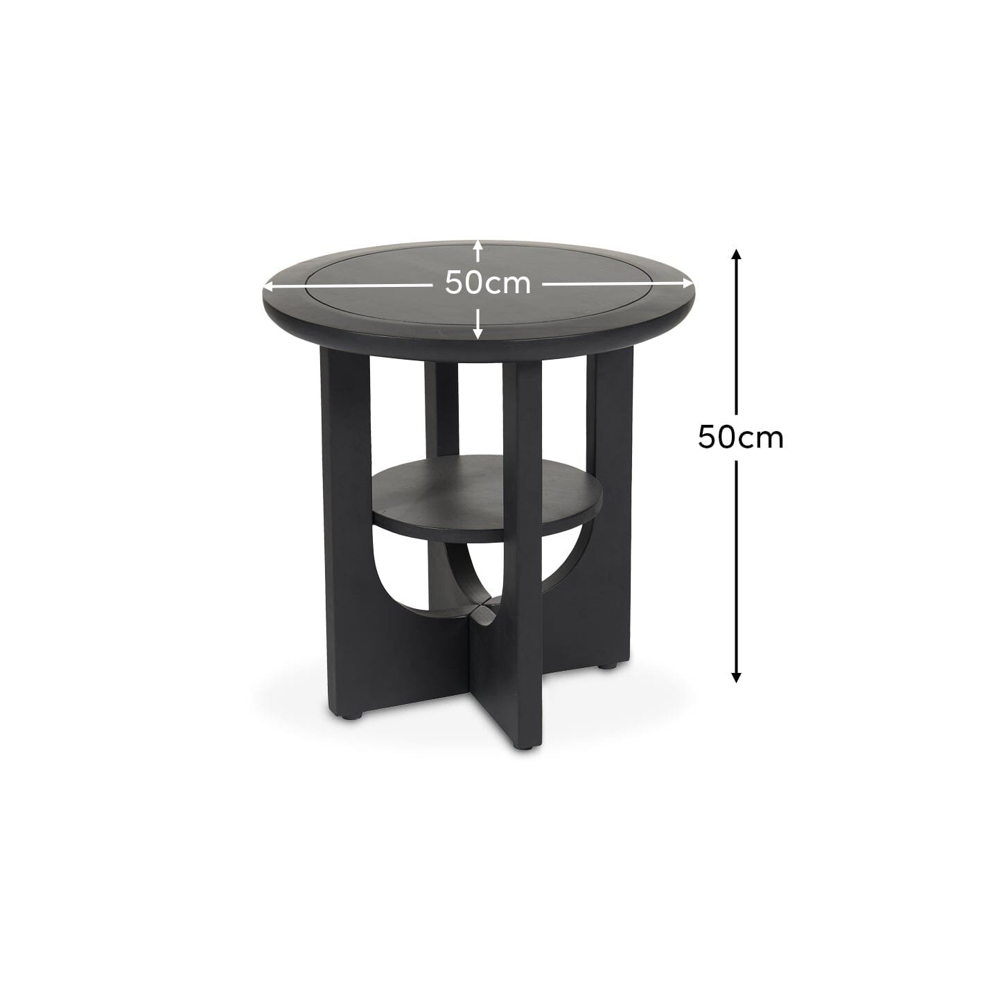 Transform any living space with the Delphi round side table. Crafted from jet black solid acacia wood, the Delphi side table features a round table top with routered edge detail for a refined finish. The Delphi also features a practical storage shelf underneath and table leg structure with cut out design.