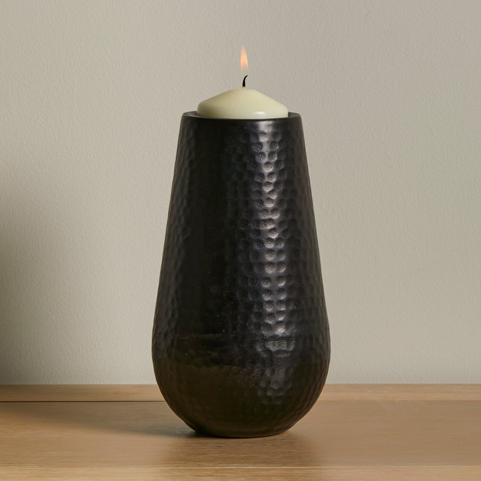 The Hale large metal candle holder comes in bronze black and features a hammered effect look. This stylish candle holder can hold a small votive candle, perfect for adding interest to a tray or mantlepiece.