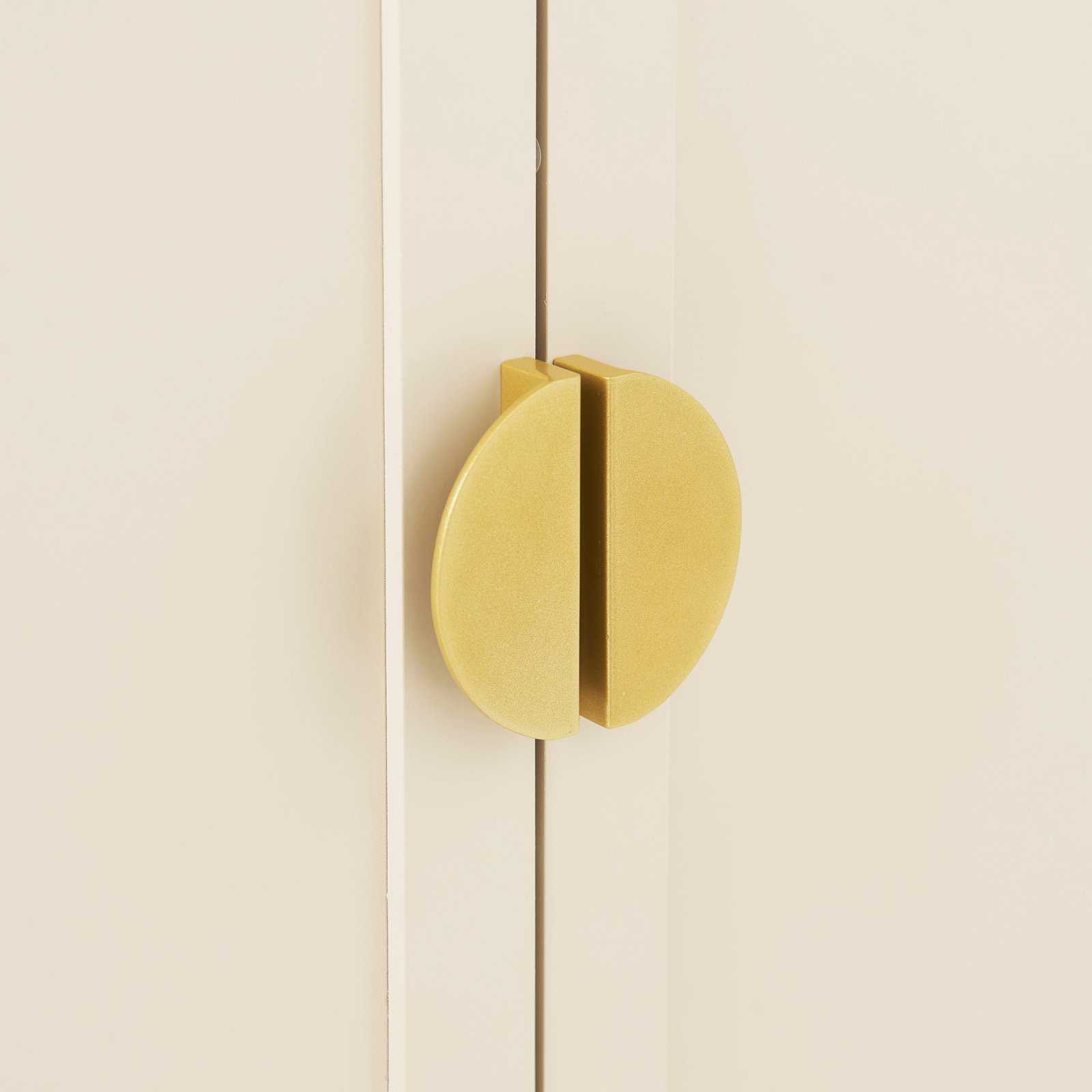 Introducing the Ines 2-door sideboard, crafted in a stylish taupe hue and featuring a subtle rounded top edge along with classic shaker style doors for timeless appeal. Its large half-moon shaped handles make a striking statement, complemented by the gold metal frame, forming a coordinated and elegant furniture piece.