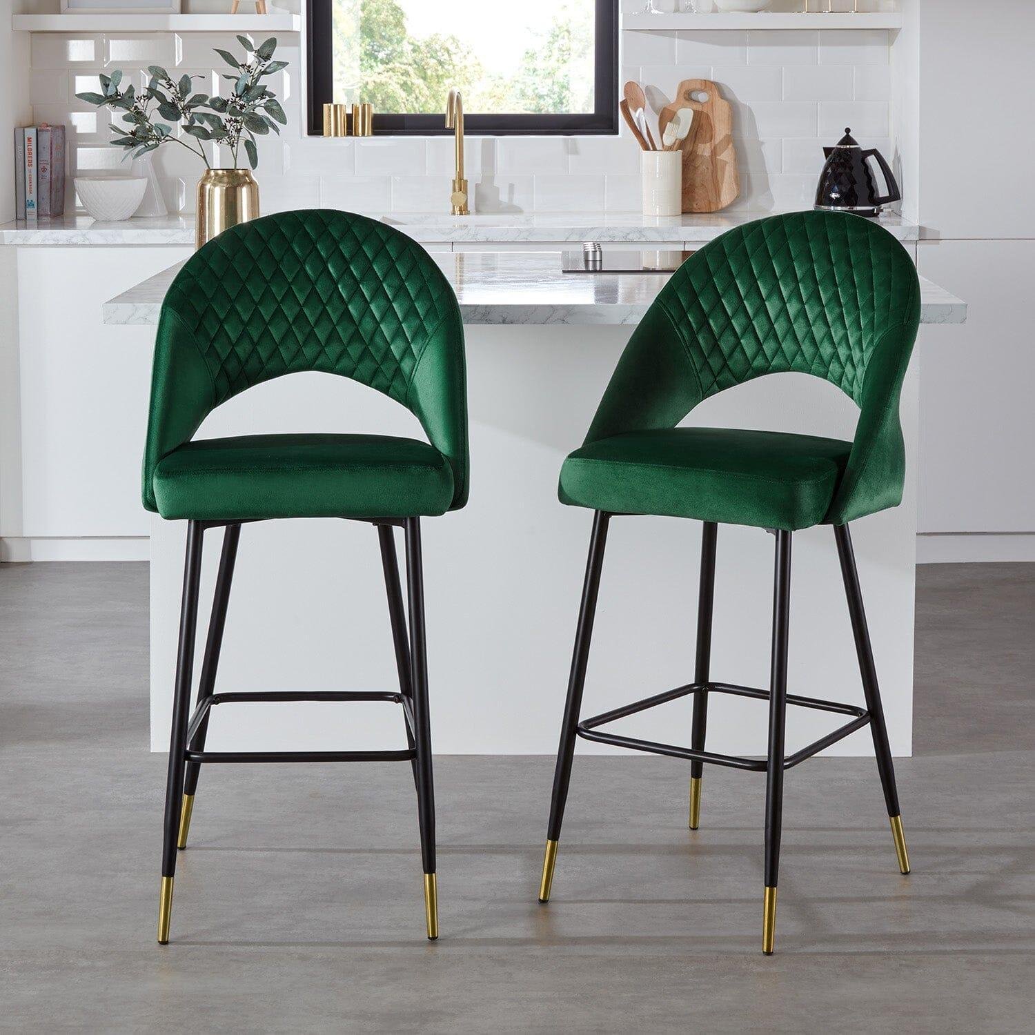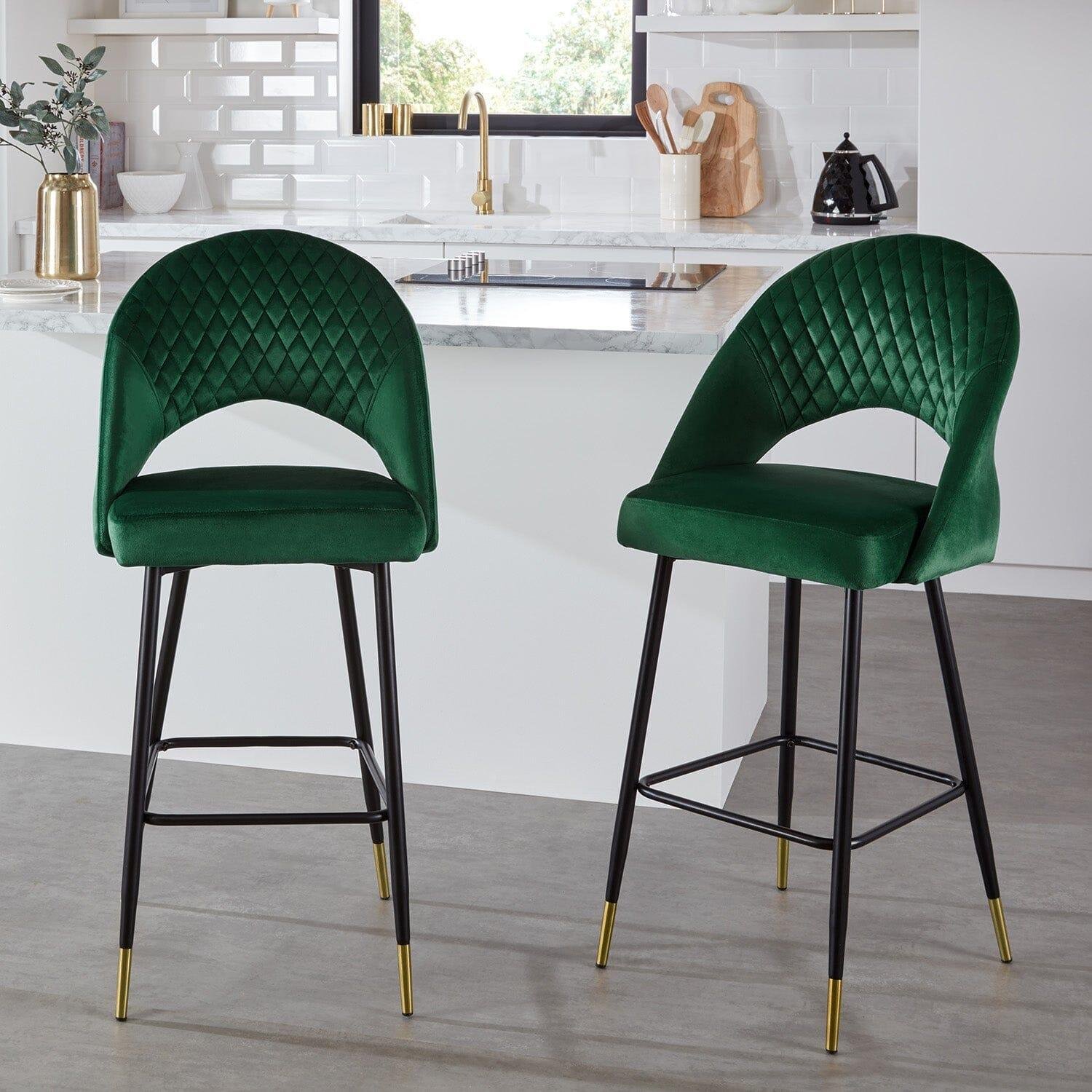 With a gently curved backrest and soft padded cushion, you can sit comfortably whilst resting your feet on the integrated footrest. The velvet upholstery also features a quilted stitched detail to add to the glamourous feel of these bar stools.