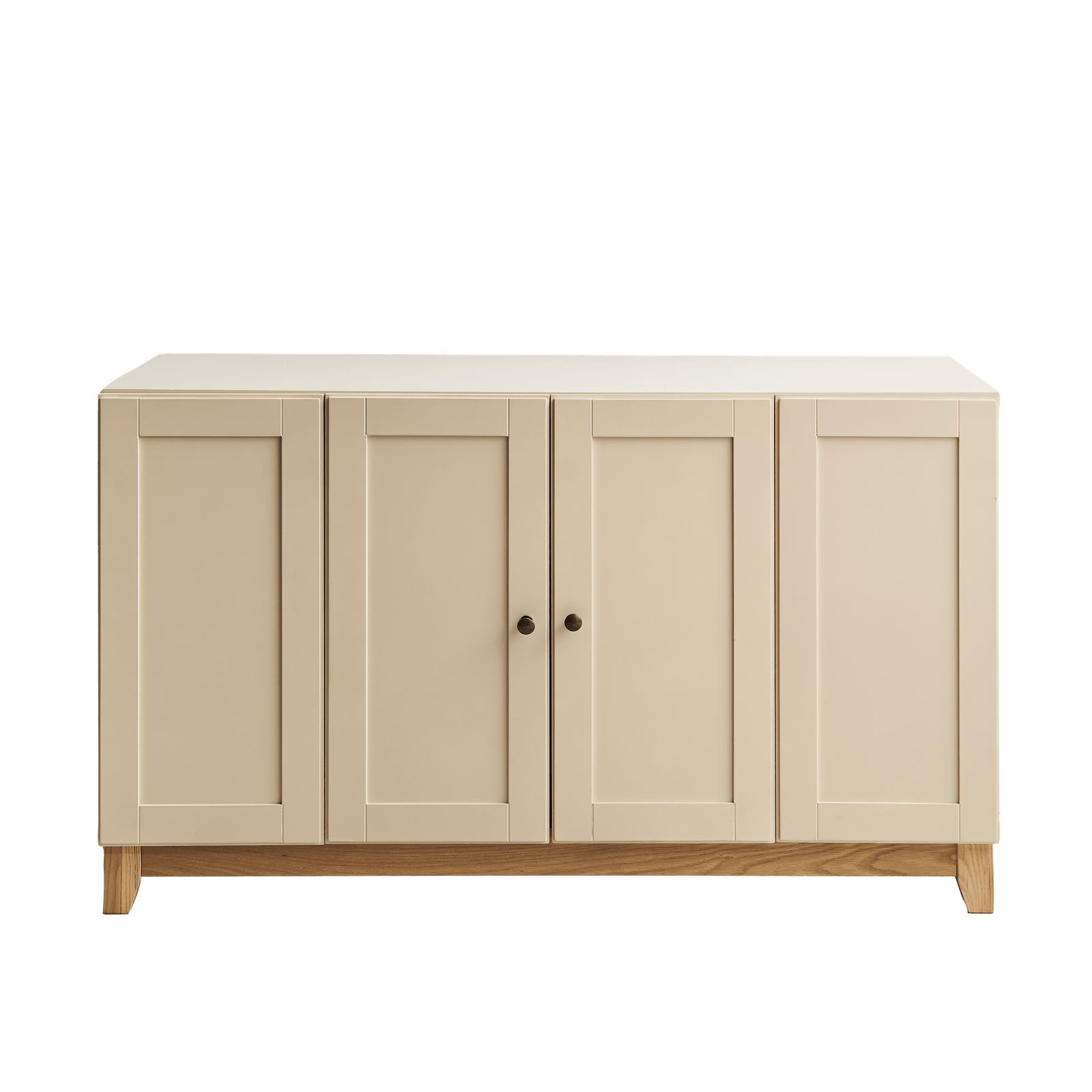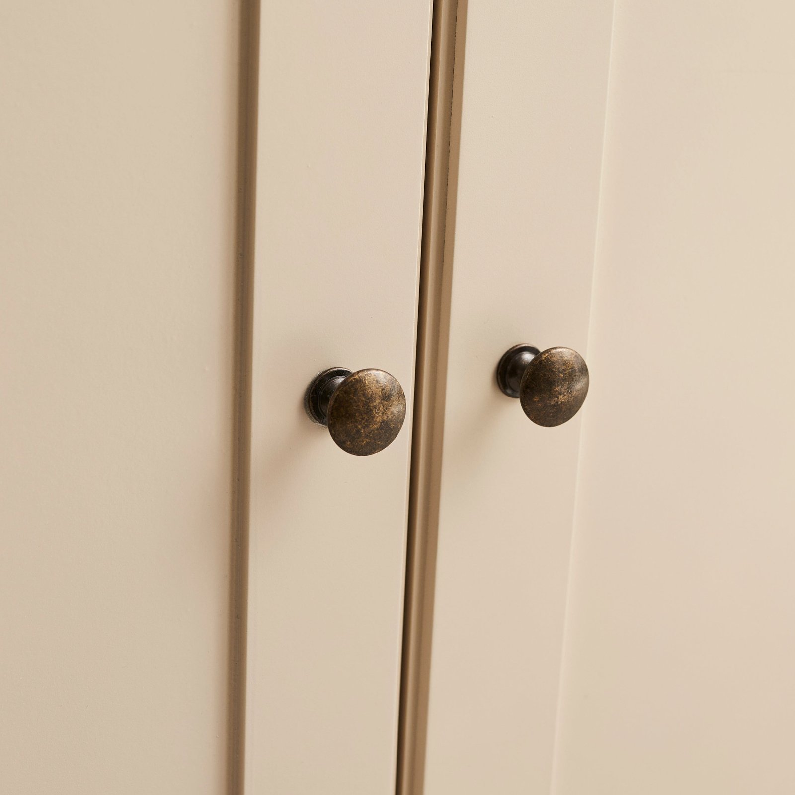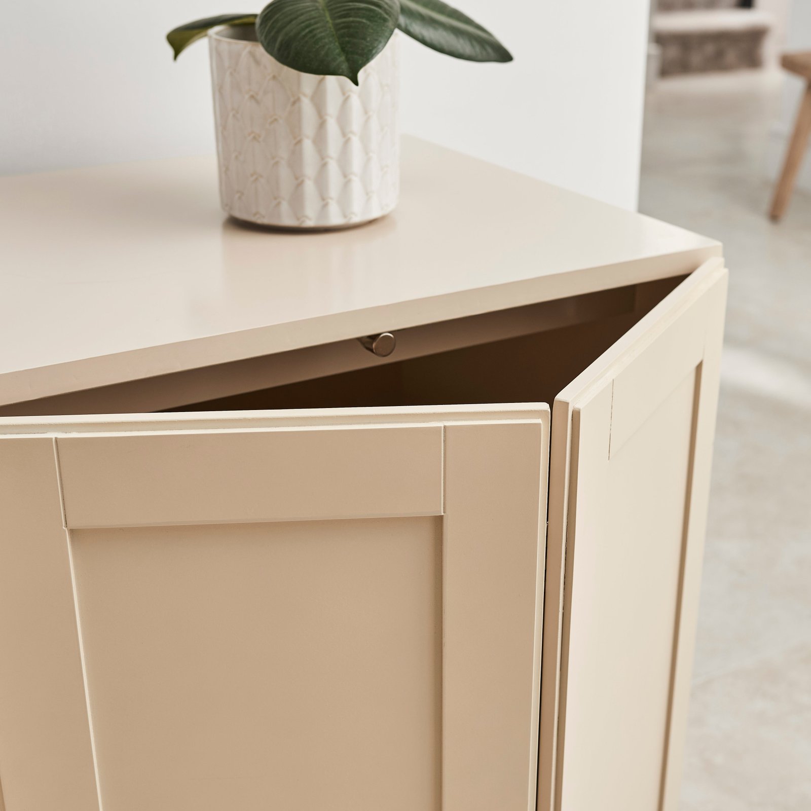 The Morgan two door sideboard features bi-fold shaker style doors with a pale oak wooden base. Painted in a chic taupe hue the doors are complete with two round handles finished in black-bronze metal for a modern touch. The bi-folding doors opens easily and folds back to allow maximum access to the interior, where there is a central wooden shelf for storage. The bi-fold design also allows the doors to take up less space when open making this ideal as a TV cabinet. The doors remain closed with magnetic catches.