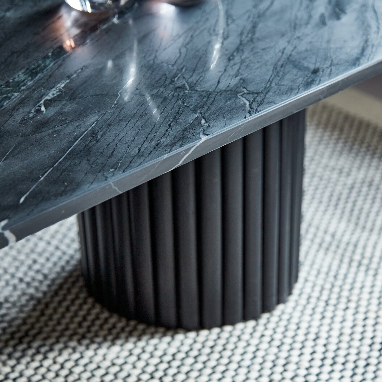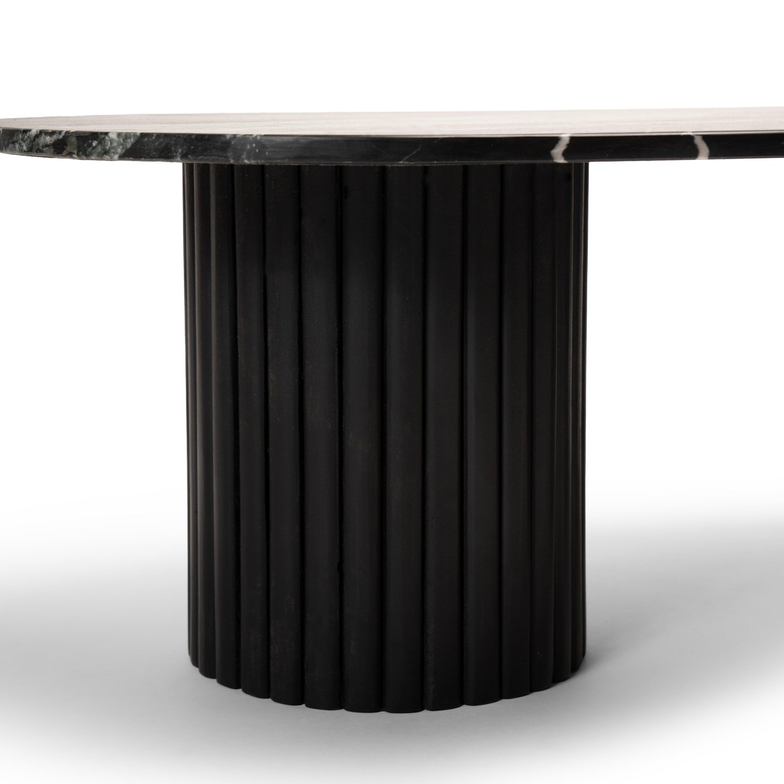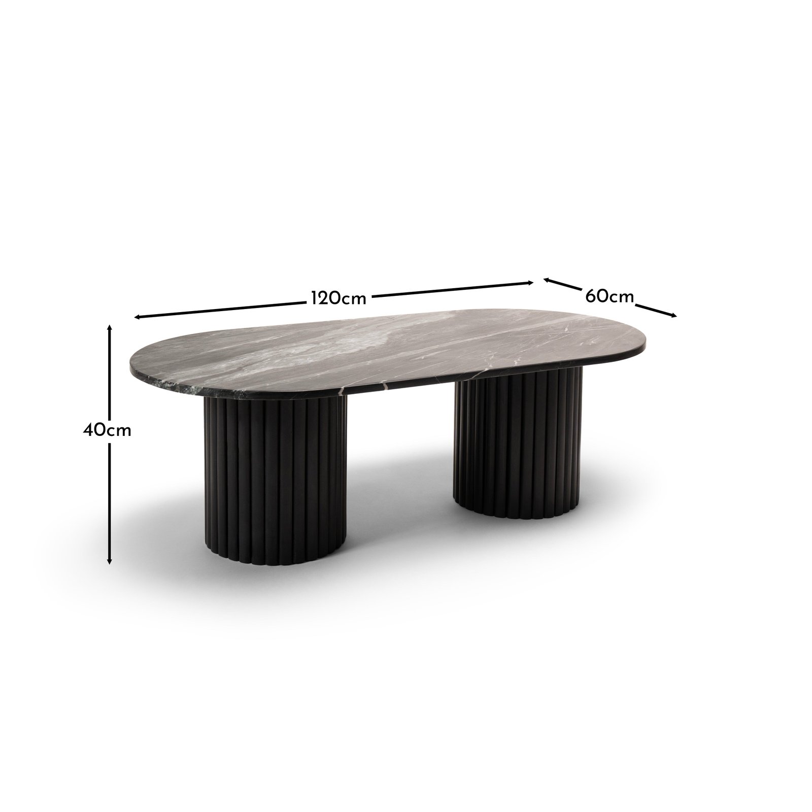 The Myla 120cm oval coffee table in jet black, new for 2024, features a solid mango wood base with fluted carvings and a luxurious real marble top. This stylish wooden coffee table is perfect for food, drinks, or can be up styled with decorative accents. A matching Myla side table is also available for a coordinated living room look.