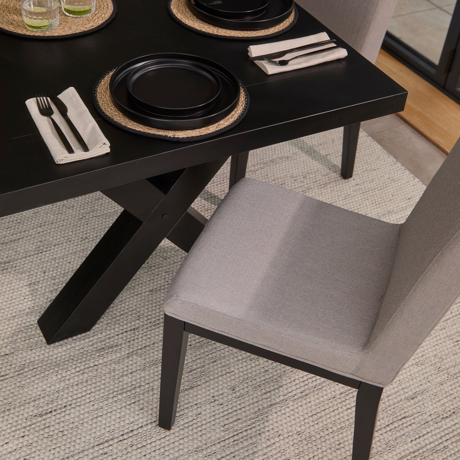 - Design features – Classic dining chairs upholstered in linen with black legs.