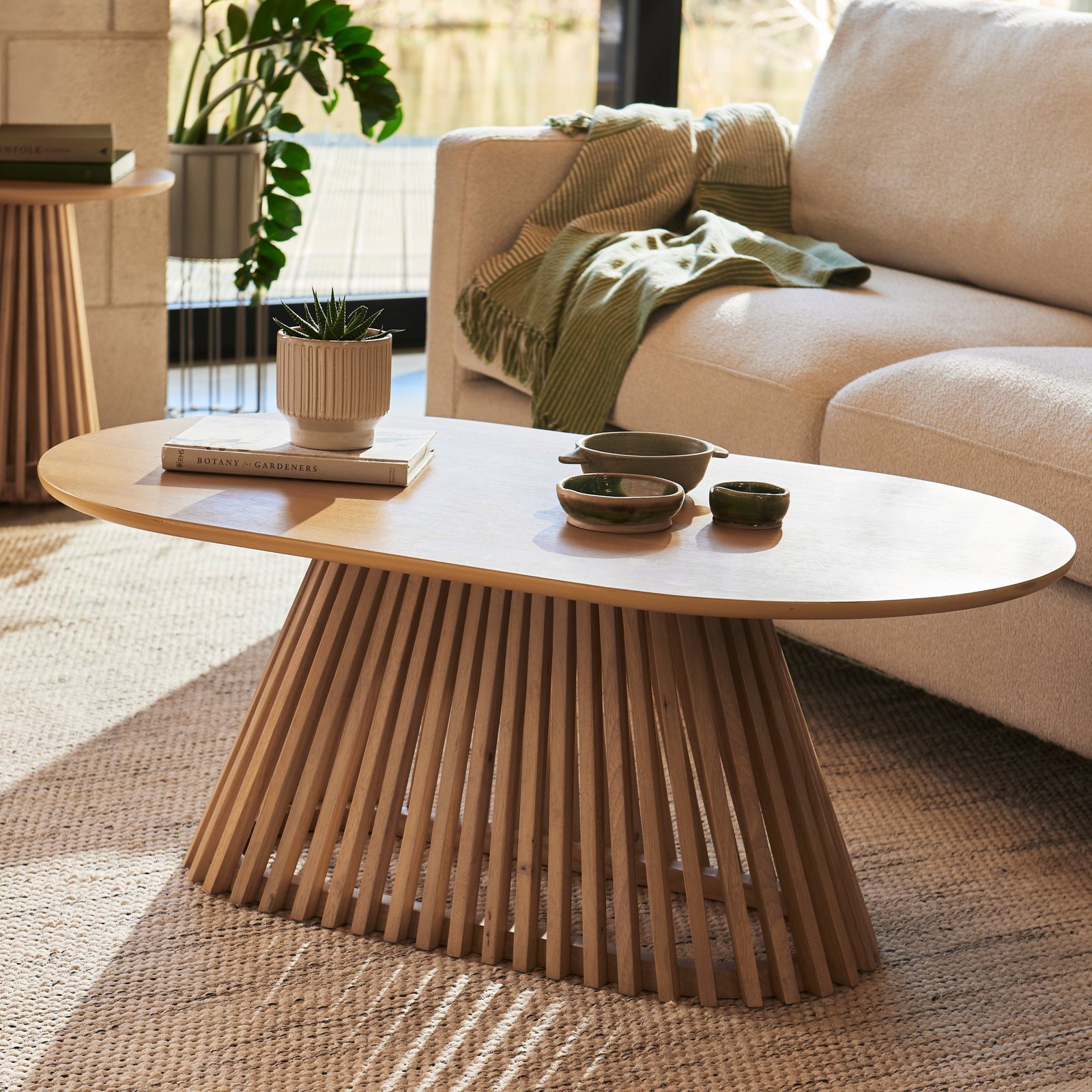 The Willow oval coffee table is a larger take on the beloved Willow round coffee table, with more space to keep living room essentials all in one place. With a curved tabletop and a sleek slatted wood pedestal base inspired by Japandi design, this spacious pale oak coffee table is stylishly modern and looks great with the Emily sofa.