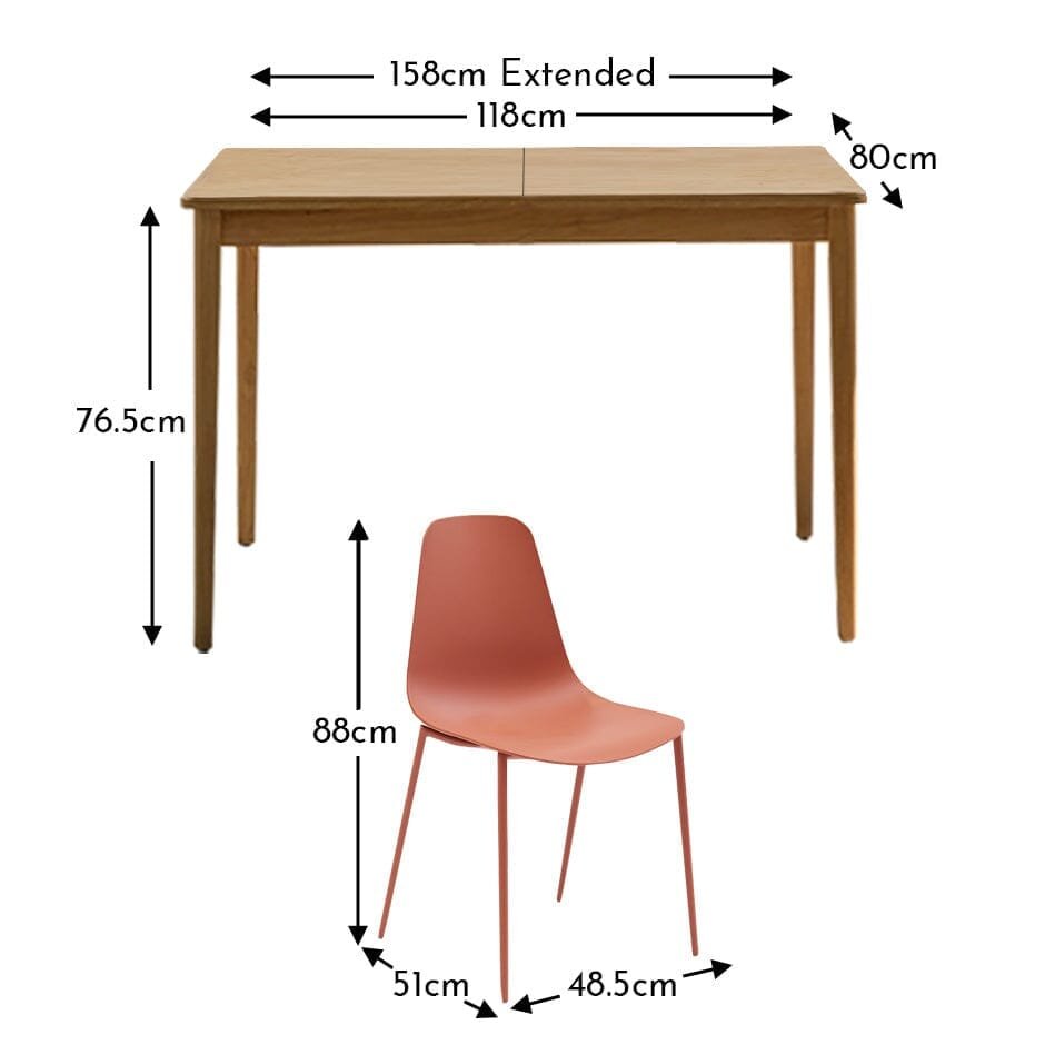 - What’s included – Paul whitewash extending dining table with 4 Wren dining chairs in burnt orange.