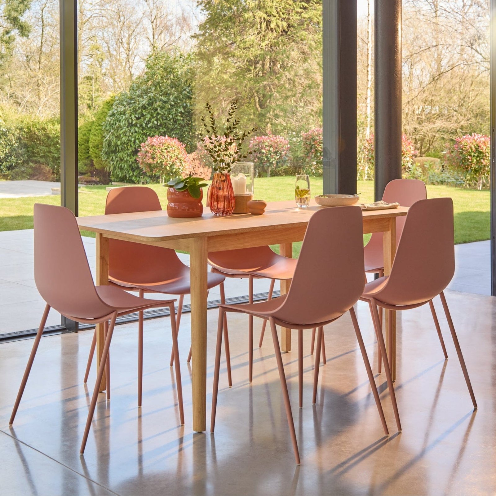 The Paul and Wren extending dining set blends contemporary style with a chic, modern design. The Wren dusty pink dining chairs feature smooth curved seats and bring a pop of colour and a stylish vibe to your space. Paired with the whitewash Paul dining table, this 6 seater dining set is ideal for smaller dining spaces.