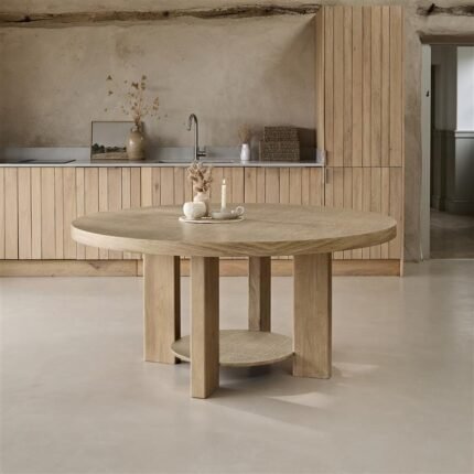 Buyer’s Notes  Elevate your dining space with the large Marlon round dining table finished in whitewash oak. Designed to impress,