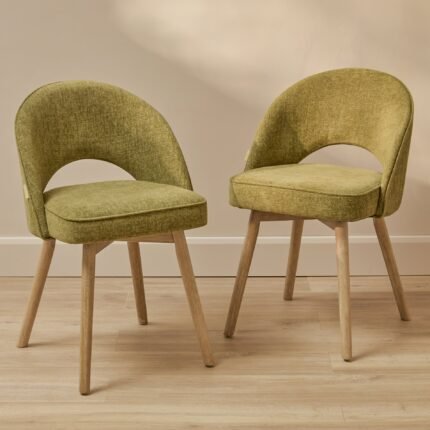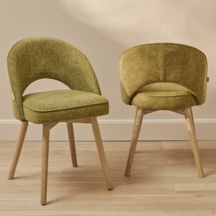 Buyer’s Notes The Marilyn dining chairs feature moss green upholstered finish with a curved back and cut out design detail.