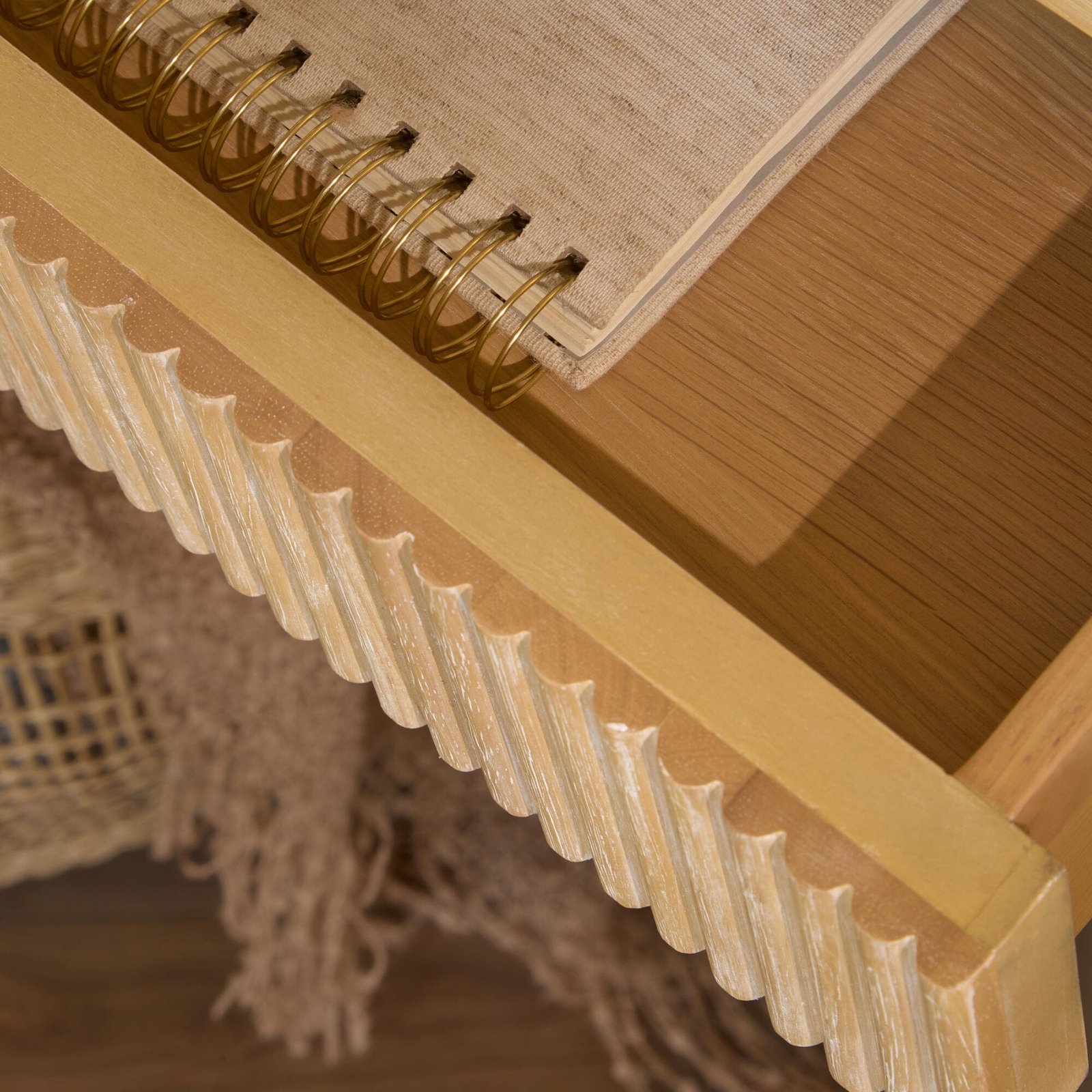 Create a stylish space in your hallway with the elegant Raleigh console table. Finished in whitewash oak the Raleigh console table features slim design with a single drawer for storage and a fluted edge finish. The drawer features a soft close function and is ideal for keeping hallway clutter such as keys and post out of sight.