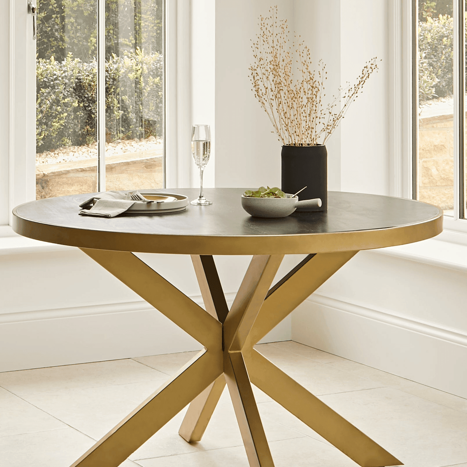 The Rayna round dining table is an Art Deco inspired small dining table made with a jet black mango wood tabletop, complemented by its golden frame and cross leg design. This 4-seater dining table is sure to grab attention and is ideal for hosting intimate dinners or catch ups with friends. This round dining table is part of the Rayna collection, which includes matching pieces like the Rayna sideboard and console table.