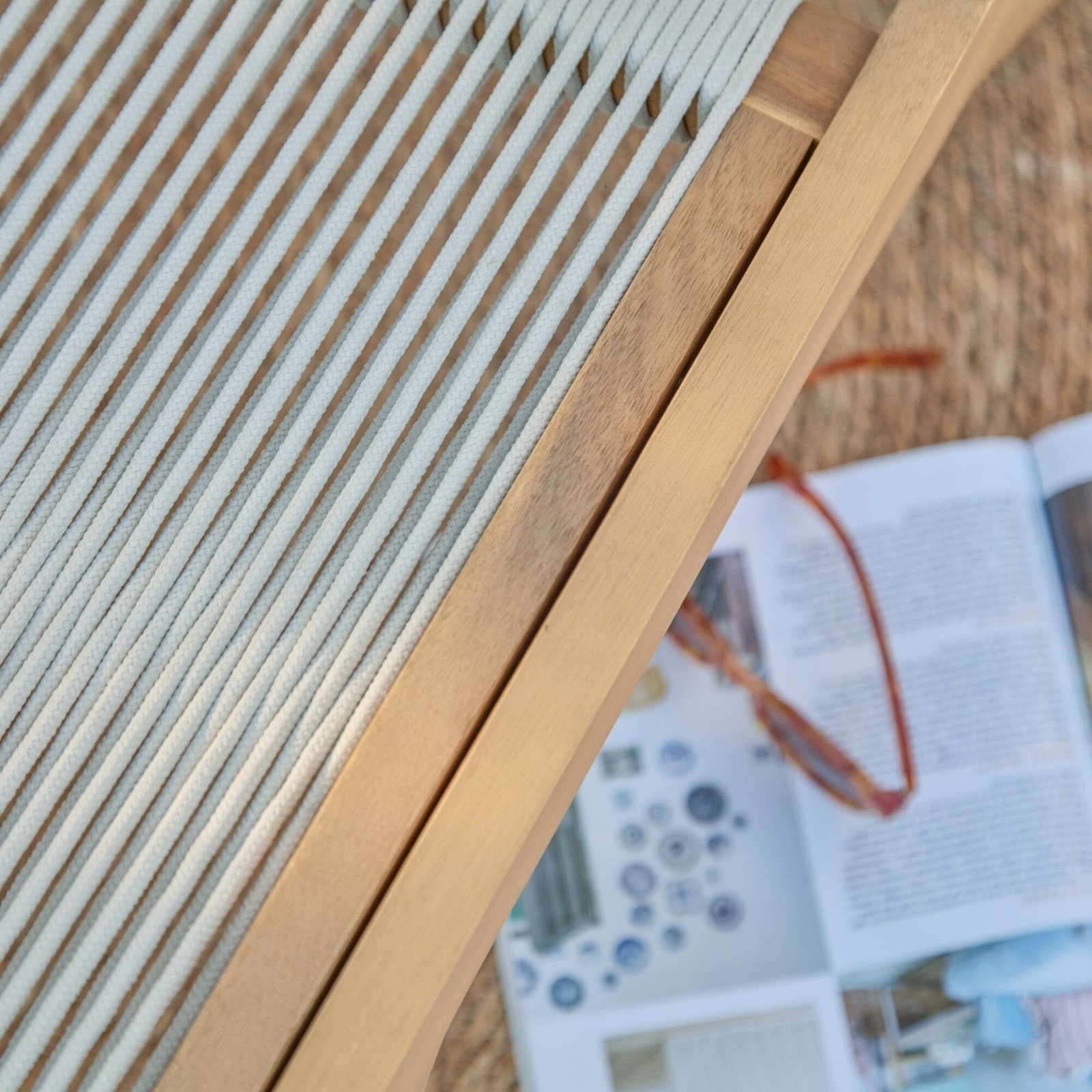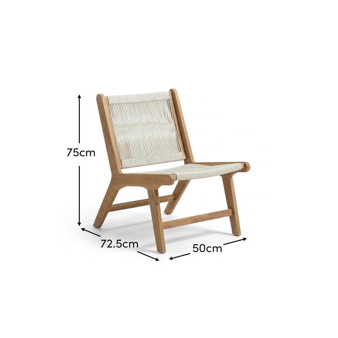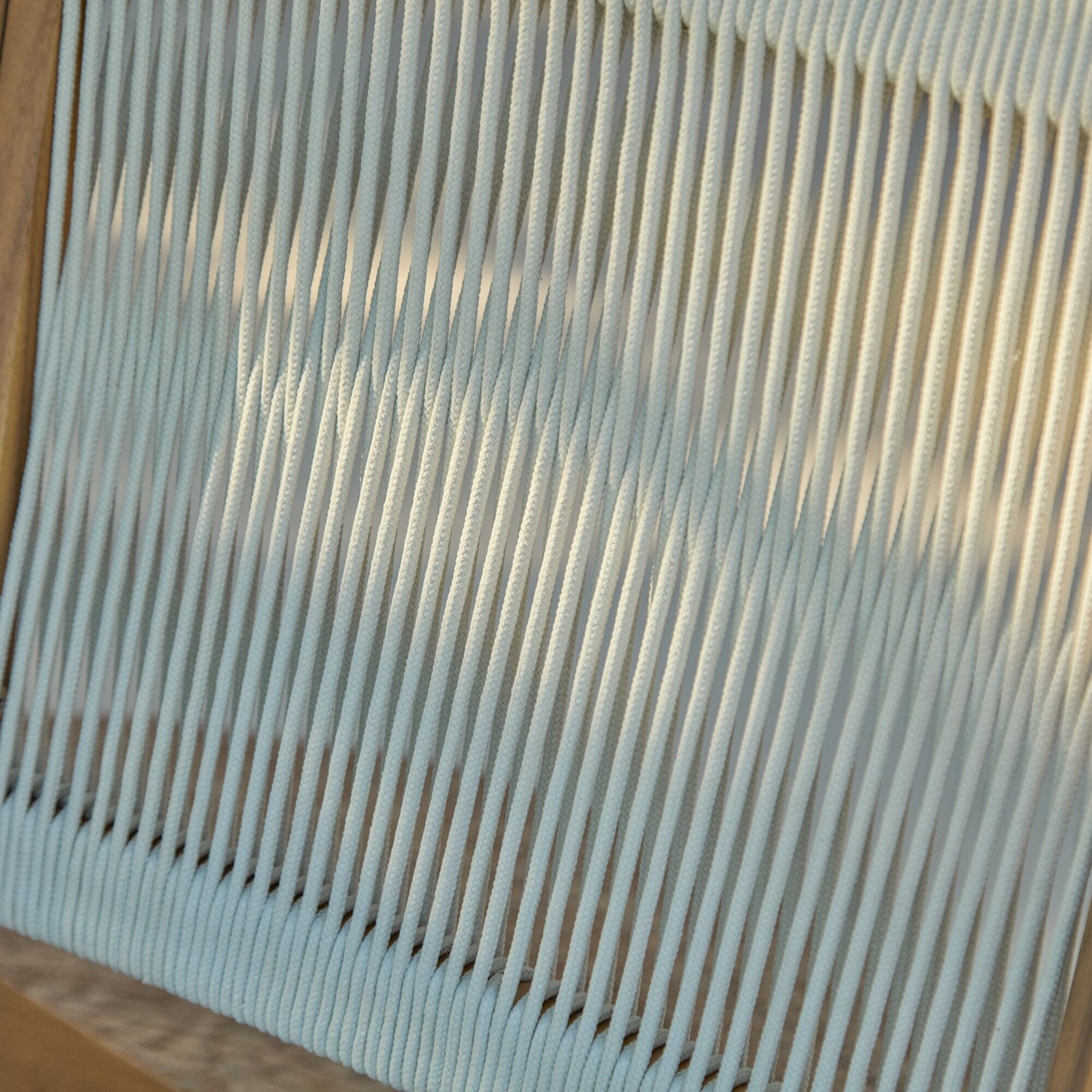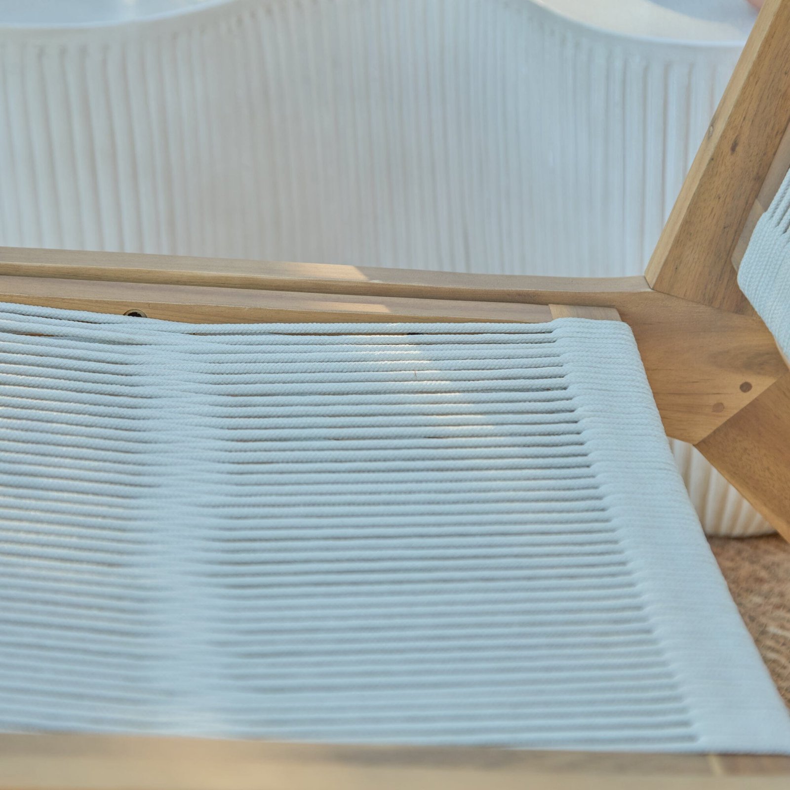 - Design features – Lounge chair with white acacia wood frame and rope seat and back rest.