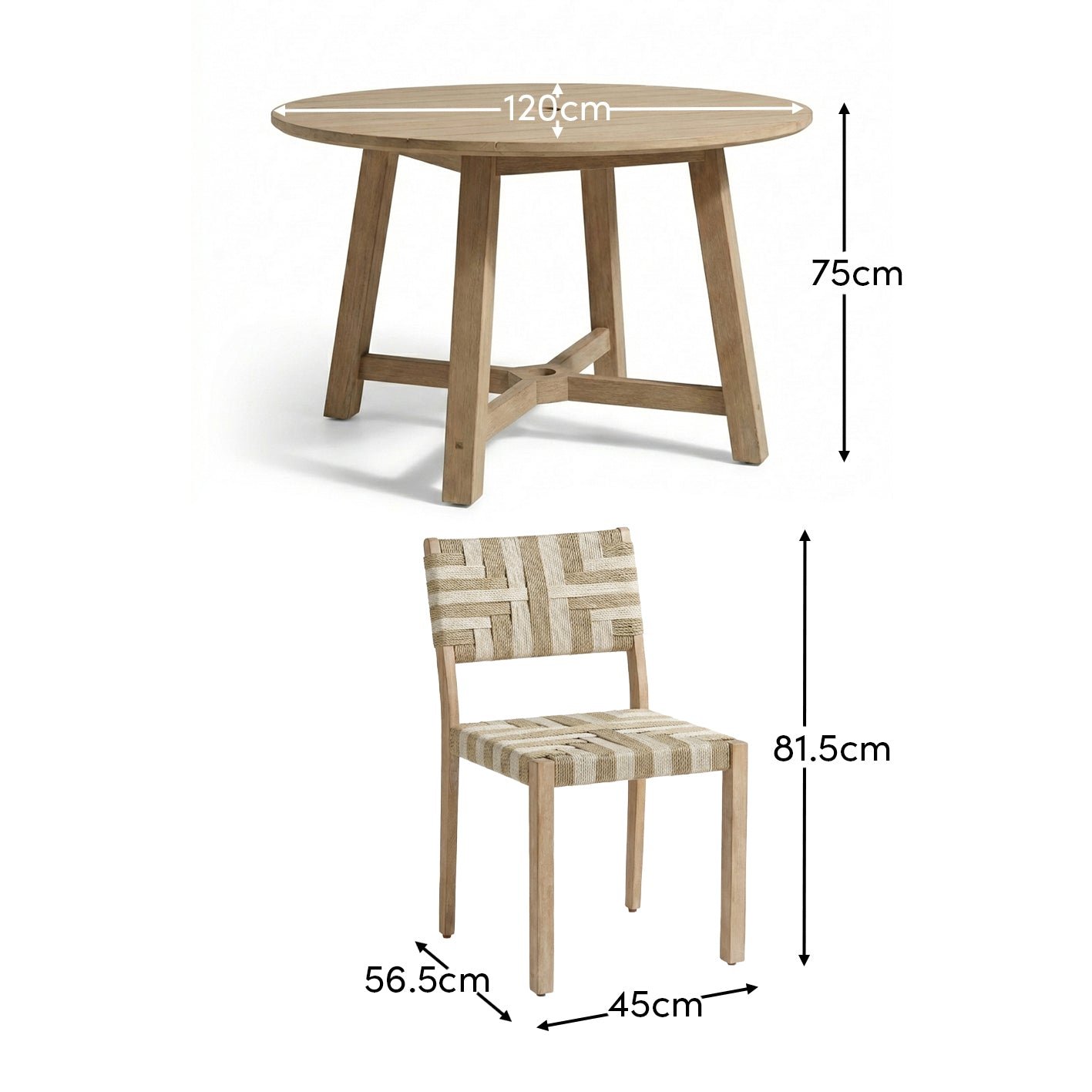 Create a stylish outdoor dining space in your garden with the Shiro and Saffron dining set. The Shiro round table is finished in light brushed acacia wood with a slatted tabletop and features 4 legs and a cross over base with a parasol hole. The table comes with 4 Saffron dining chairs each featuring a wooden frame and statement woven geometric pattern in natural and beige rope creating a statement look.