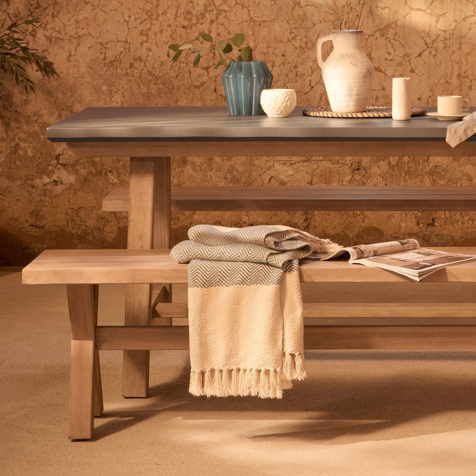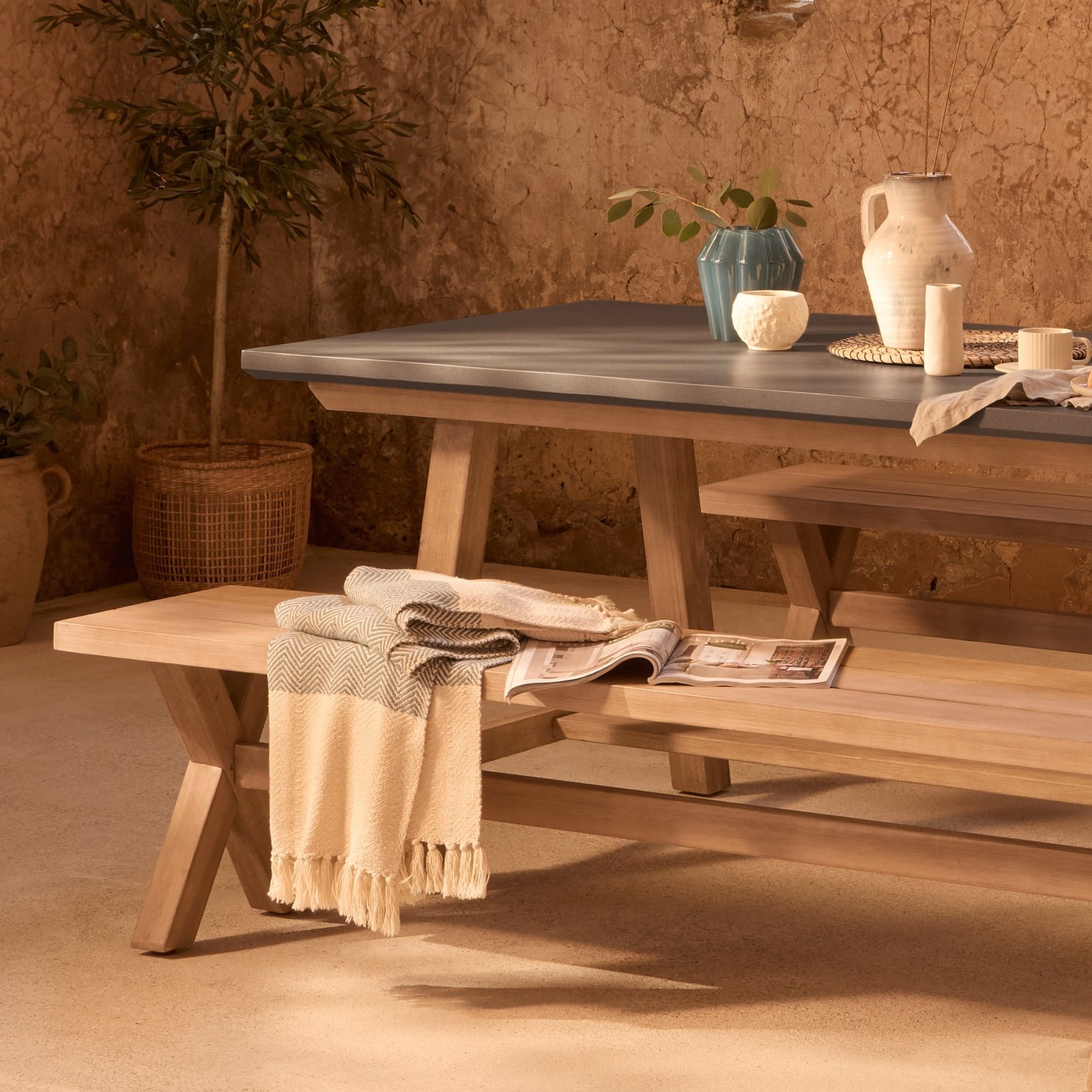 This outside dining set is ideal for relaxed dining with the friends and family. The long-lasting durable acacia wood and concrete finish means this set will last season after season.