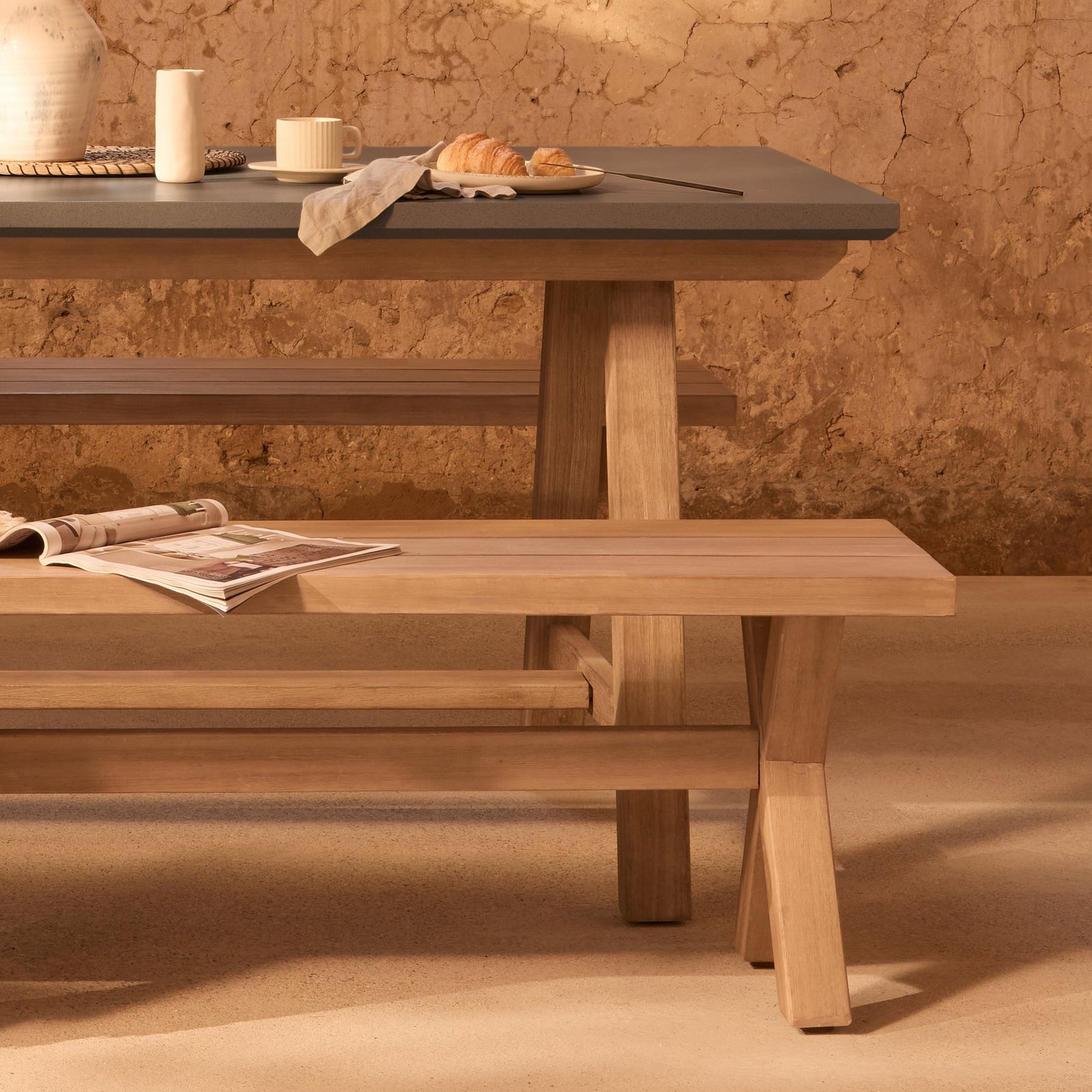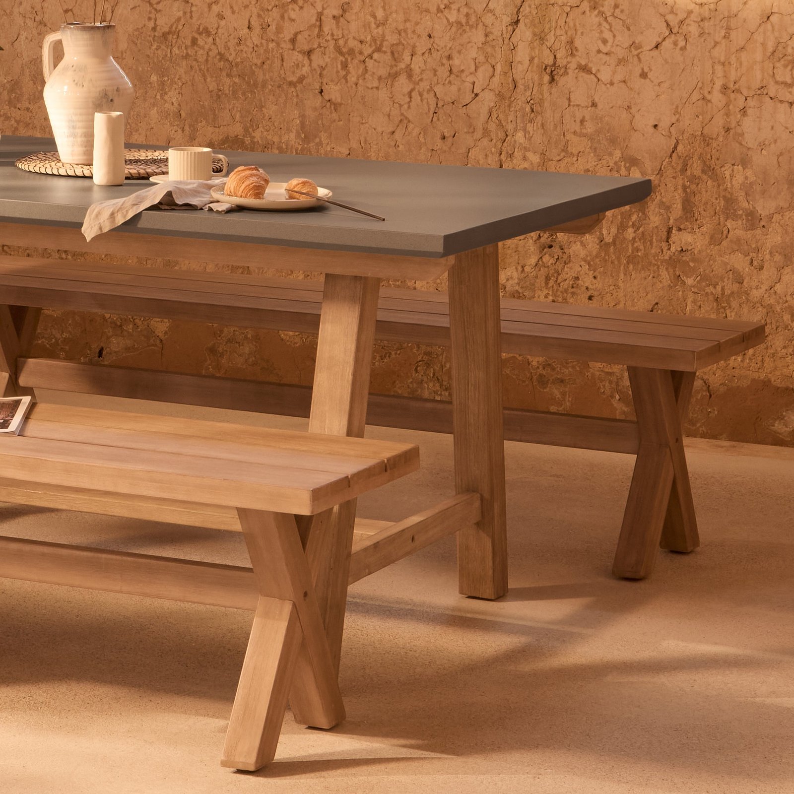 Create a stylish spot for outdoor dining with the Shiro rectangular dining table featuring a dove grey concrete rectangular tabletop and legs crafted from brushed acacia wood for a premium look. The dining set is complete with two Charlotte benches with a charming picnic style cross over leg design made in acacia wood to match the Shiro table.