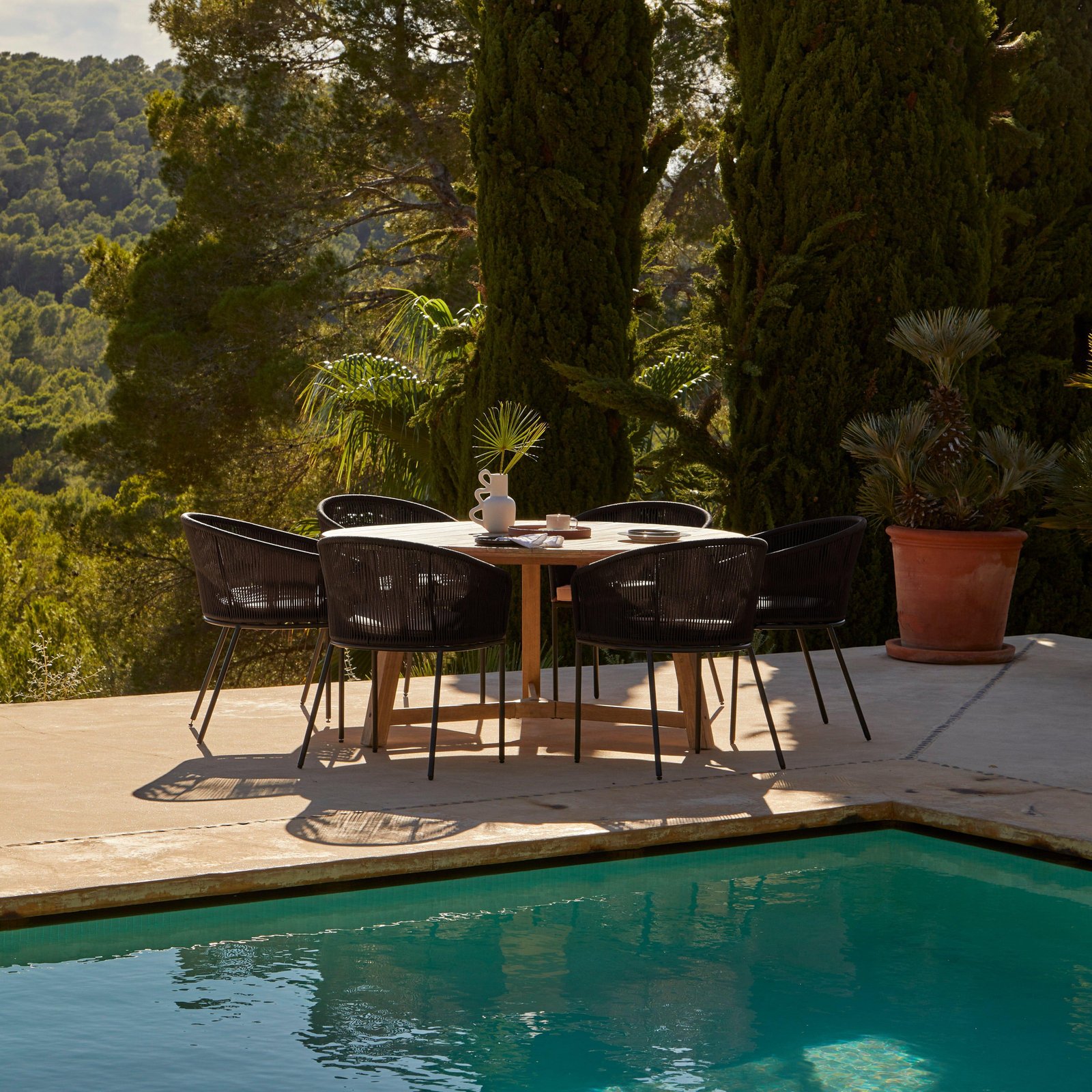 Shiro 6 Seater Wooden Round Garden Dining Table with 6 Hali Black Rope Chairs – 160cm