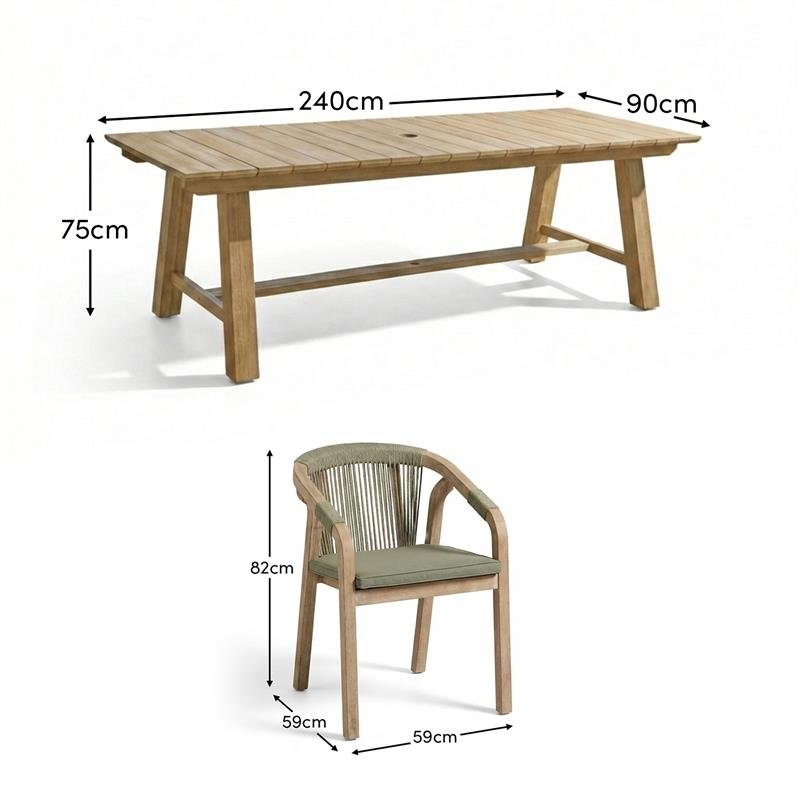 Elevate your outdoor entertaining space with the Shiro dining set. Crafted in acacia wood known for its strength and durability the set features the Shiro large 8 seater table with slatted tabletop and 8 Shiro chairs. Each Shiro chair features a curved back with slats and a mottled green rope woven design for a contemporary look.