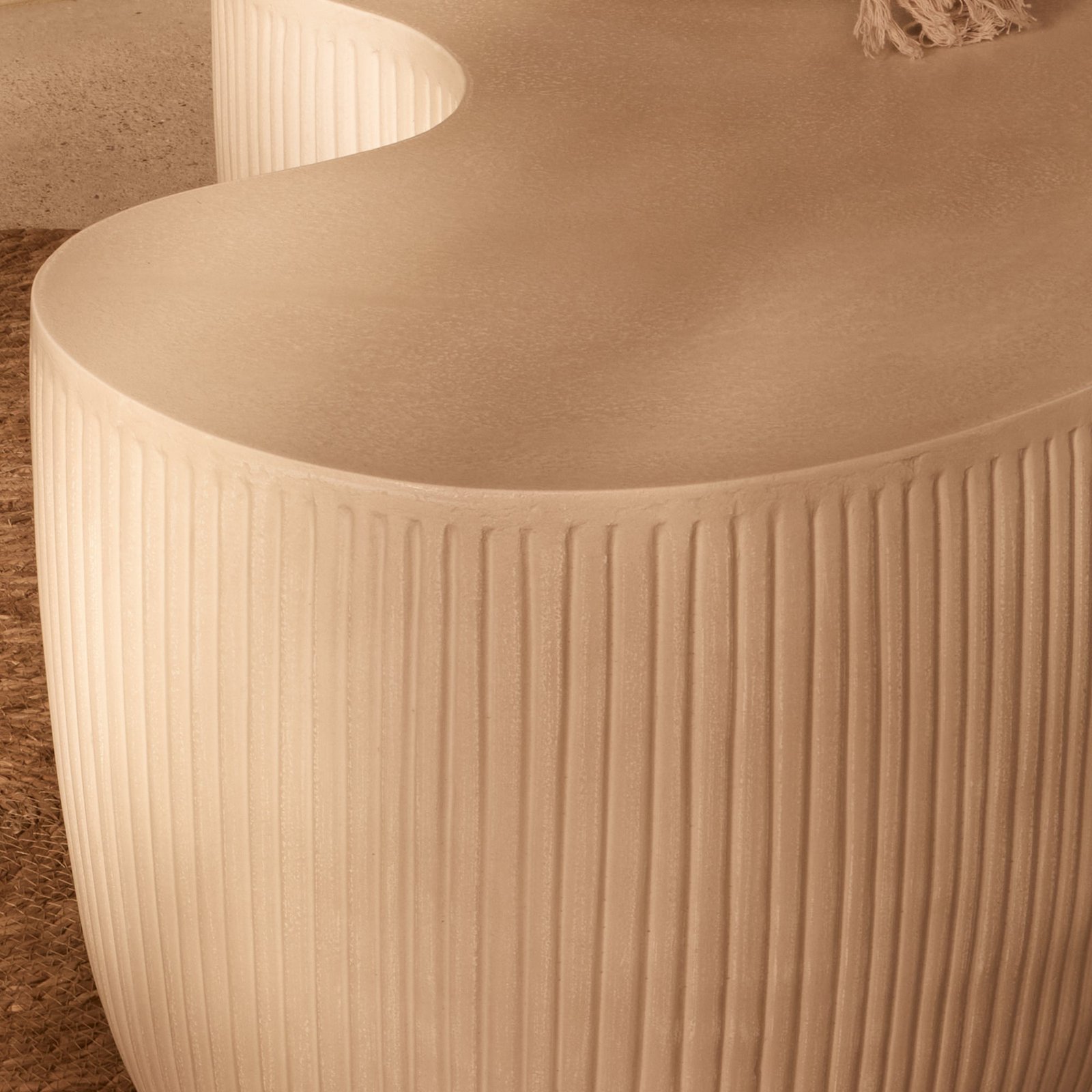 - Design features – Set of 2 kidney shaped tables in sand coloured concrete with ribbed edging. Can be used both indoors and outdoors.