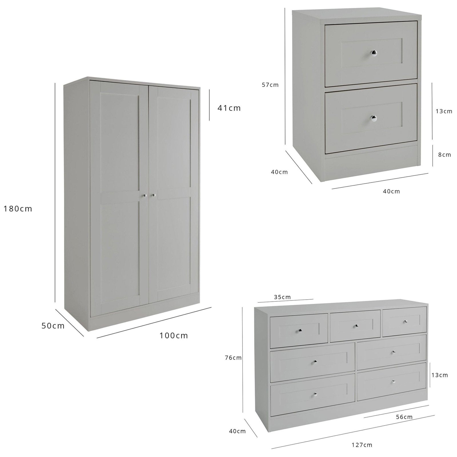 Make your bedroom beautiful with this gorgeous painted grey bedroom set, featuring all you need to keep your bedroom organised and clutter-free. This shaker style wardrobe, large chest of drawers, and bedside table set has classic inlays for a sleek design. Pair with a velvet ottoman bed and chic furnishings to create a hotel luxe bedroom.