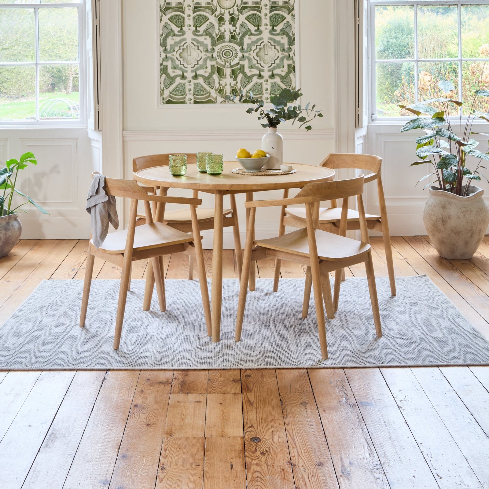 Elevate your dining space this season with the Tilly round dining table finished in whitewash oak. Crafted from oak veneer and rubberwood the Tilly table features a raised lip around the edge of the table for an elevated feel and spindle legs for a classic look.