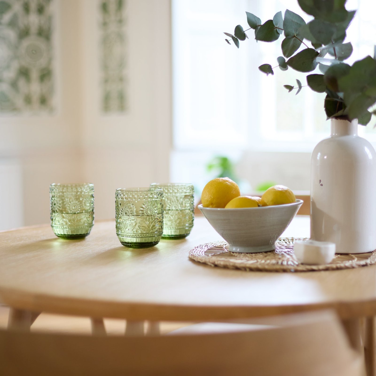 - Design features – Round 100cm table with raised edge in whitewash oak.