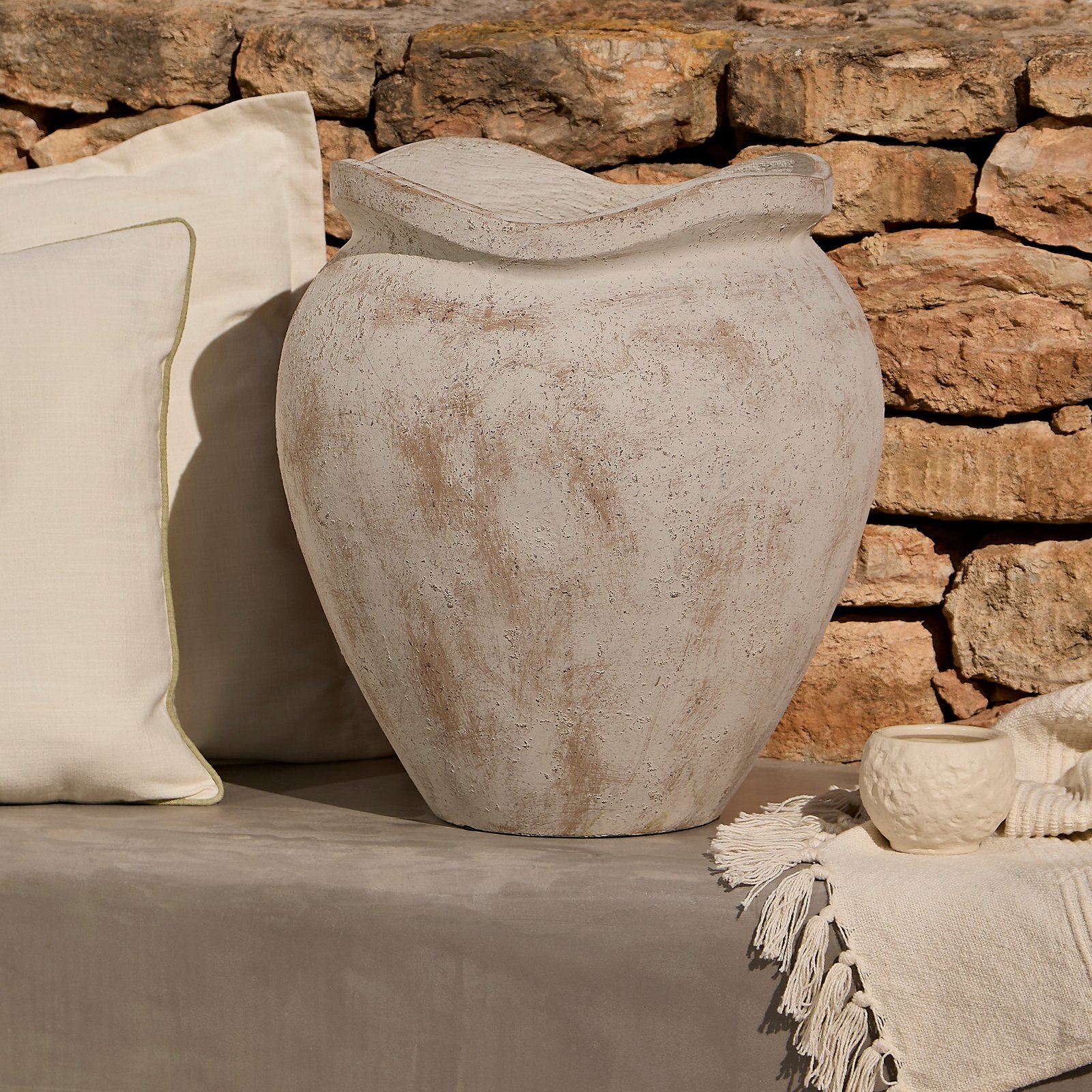 Elevate your outside space this season with the large Tomar wide planter. The Tomar planter is finished in rustic white and features an elegant curved organic design with a wavy edge top for texture and charm.