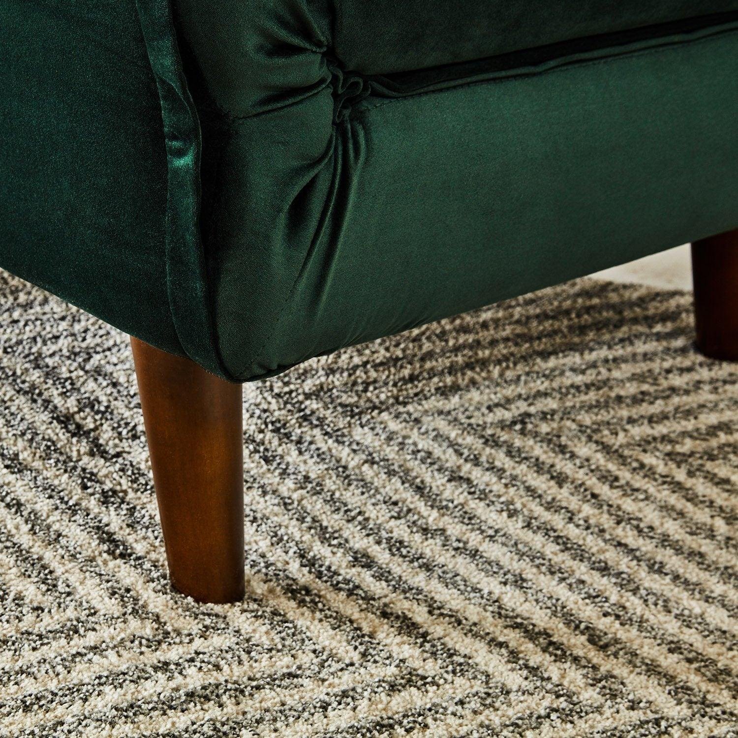 - Finish/material – Upholstered velvet with solid wood legs.