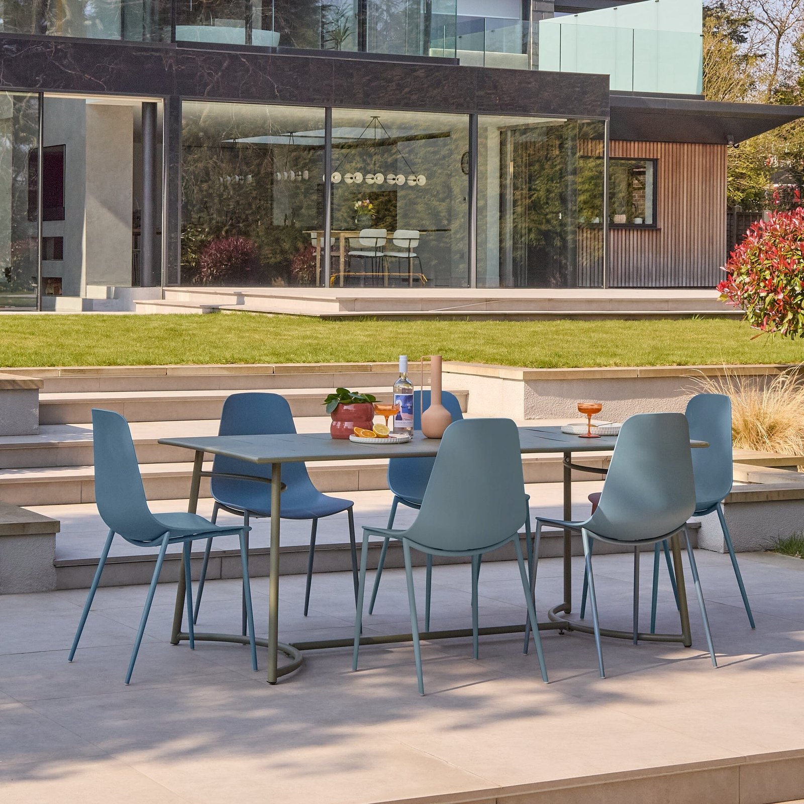Create a contemporary outside dining space with this stylish and functional dining set. The Wilder metal dining table is finished in olive green and comes with six Wren dining chairs in denim blue creating a stylish and fun colour combination. This colourful set creates an inviting space to dine al fresco.