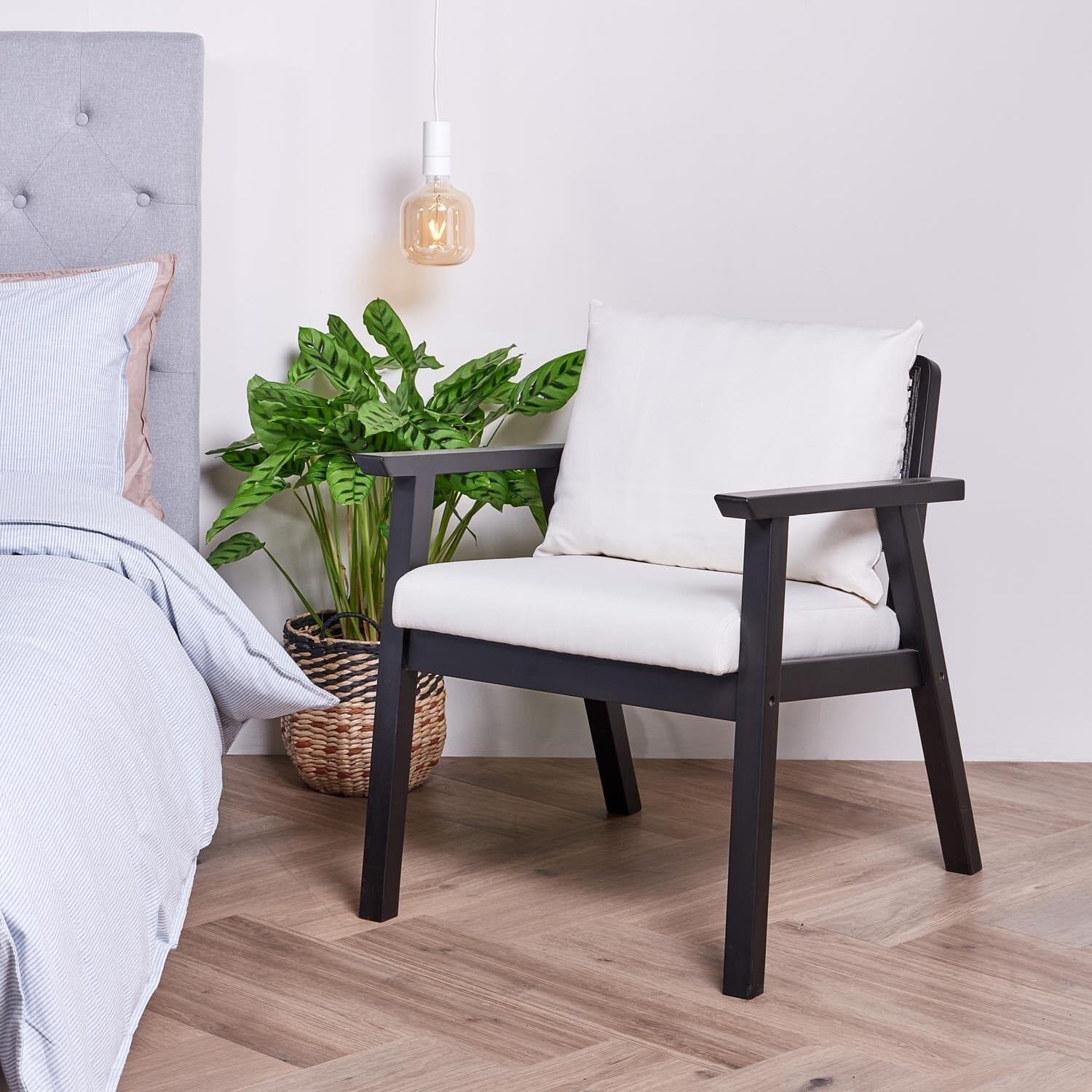 Contemporary in both shape and style, the Willow armchair is the perfect addition to any living space or bedroom for a cosy spot to sit back and relax.The Willow armchair features a woven rattan detail on the backrest with two cream upholstered cushions, to provide plenty of comfort and support.