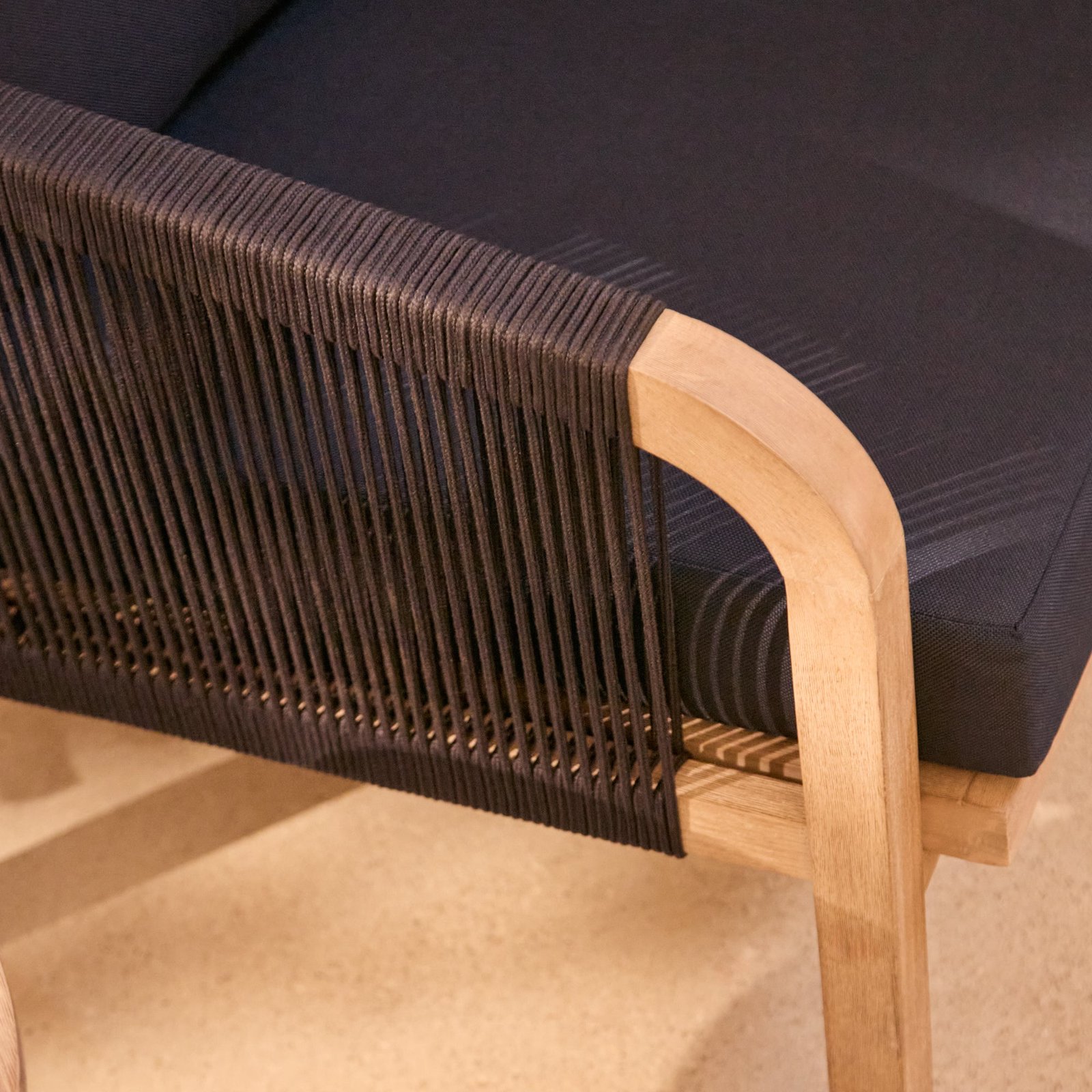 - Sofa design & chair design features – Curved wooden frame with navy woven rope design and neutral seat cushions.