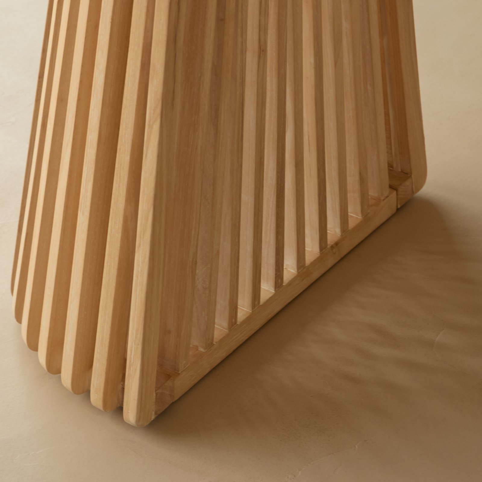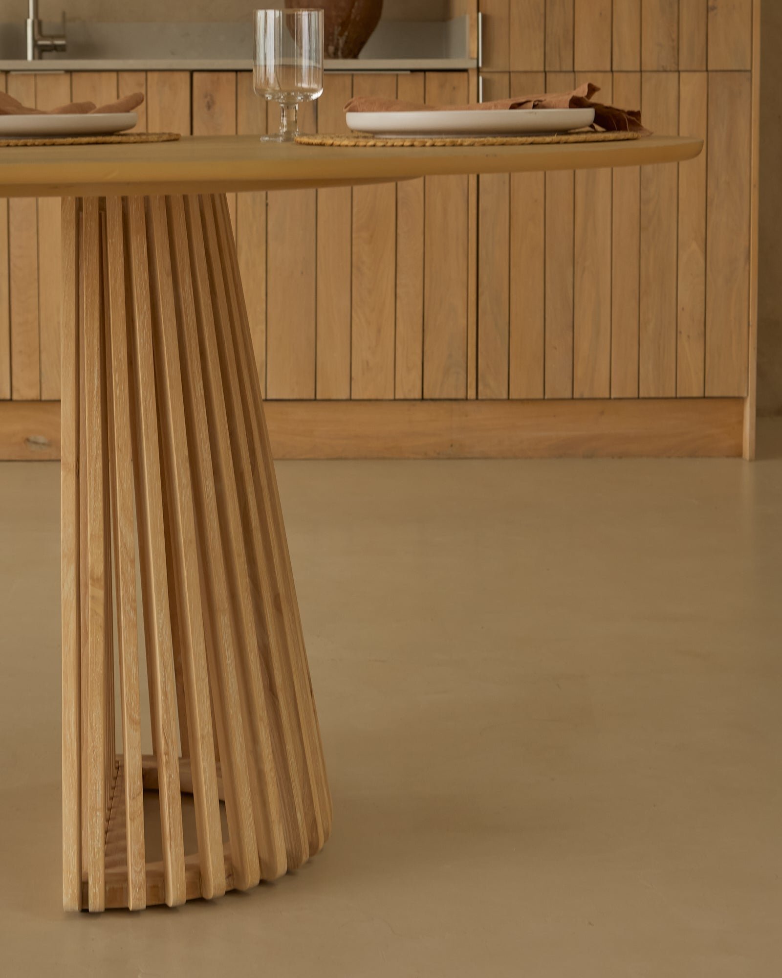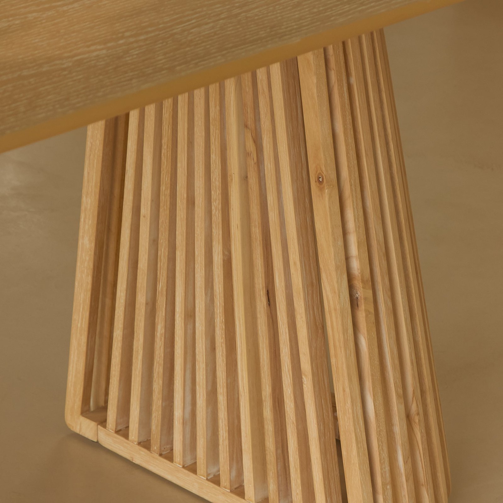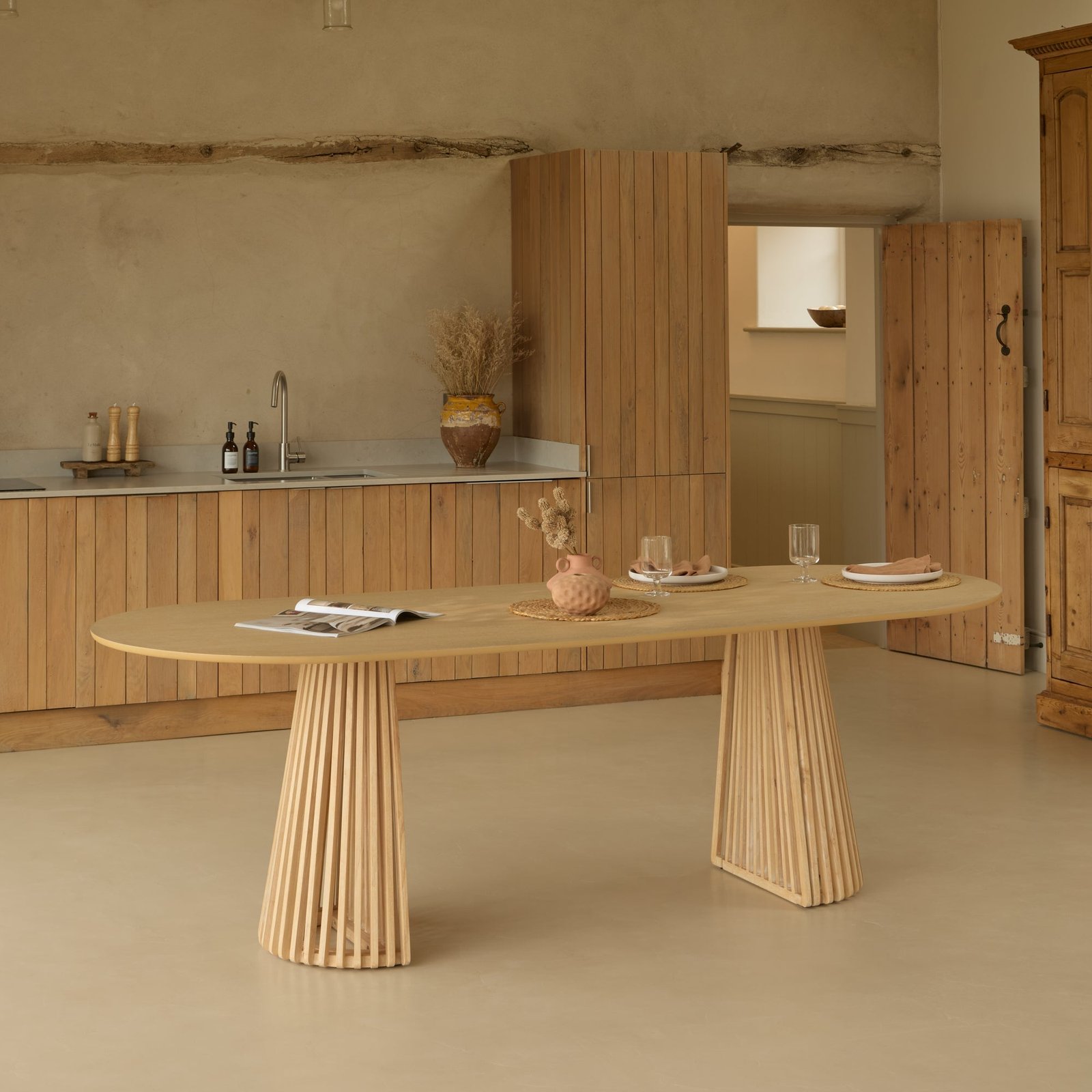 • Table design features – Oval table with slatted pedestal base, and whitewash finish.