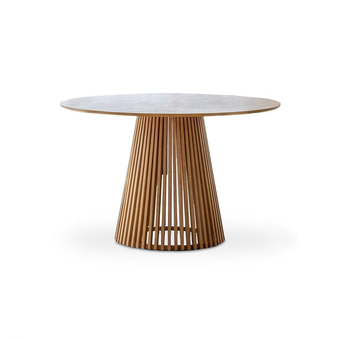 - Table design features – Round dining table with slatted wood pedestal base & hole for parasol.